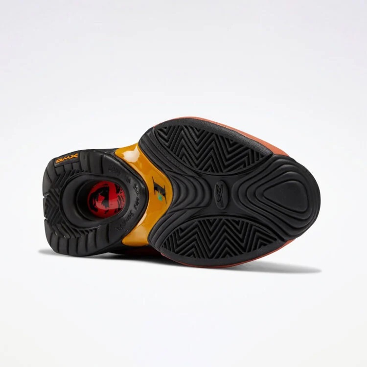 L’empeigne et la couverture sur le dessus de la languette sont en noir, avec des marques d’orange au niveau de celle-ci, tout comme sur les contours du I3 dont le 3 ressort aussi en orange, que l’on trouve également au milieu de la semelle. Les éléments « classiques » de la Answer IV sont également présents, du « DMX » au visage d’AI apparaissant sous la chaussure en noir et rouge.