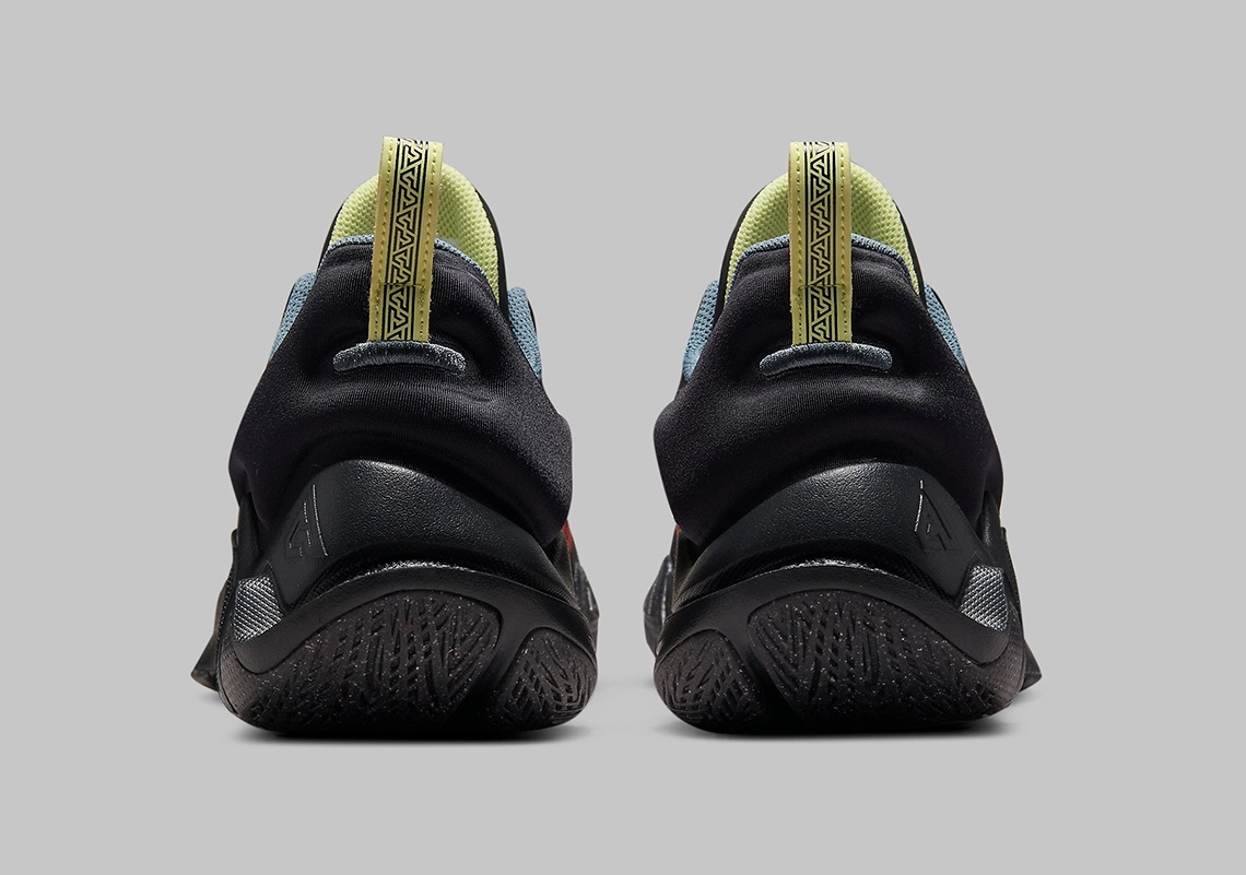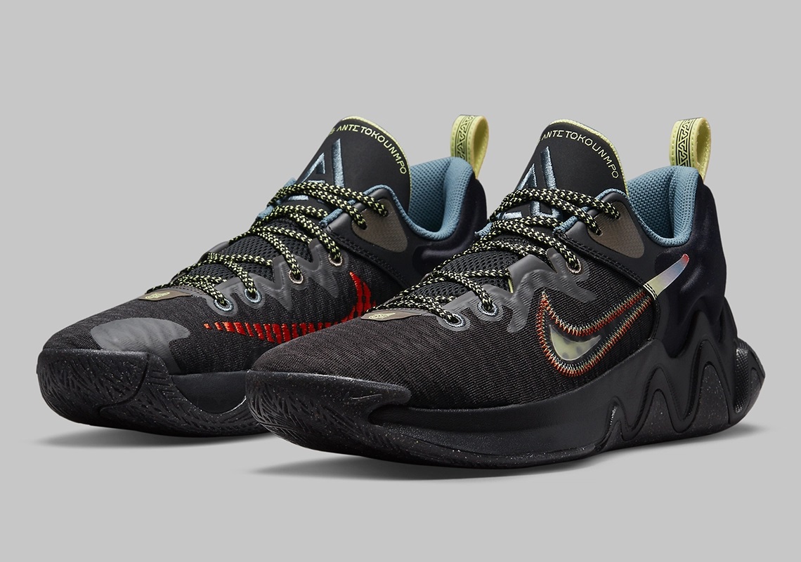 Celui-ci est essentiellement noir, avec de légères teintes de jaunes sur les lacets, la tirette, et le haut de la languette où le nom du MVP des finales 2021 est inscrit. Les deux virgules ressortent pour leur part avec des contours en jaune, orange et rouge autour du « Swoosh » présent sur l’empeigne extérieure, et un logo en rouge vif de l’autre côté.