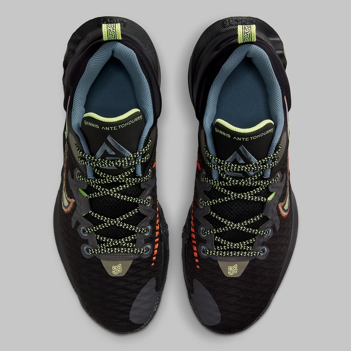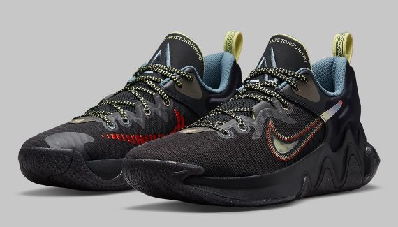 Celui-ci est essentiellement noir, avec de légères teintes de jaunes sur les lacets, la tirette, et le haut de la languette où le nom du MVP des finales 2021 est inscrit. Les deux virgules ressortent pour leur part avec des contours en jaune, orange et rouge autour du « Swoosh » présent sur l’empeigne extérieure, et un logo en rouge vif de l’autre côté.