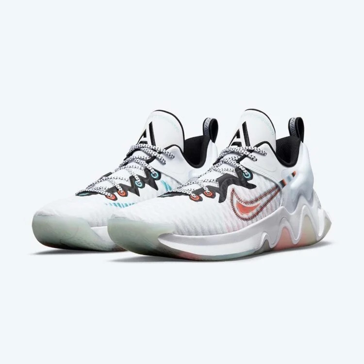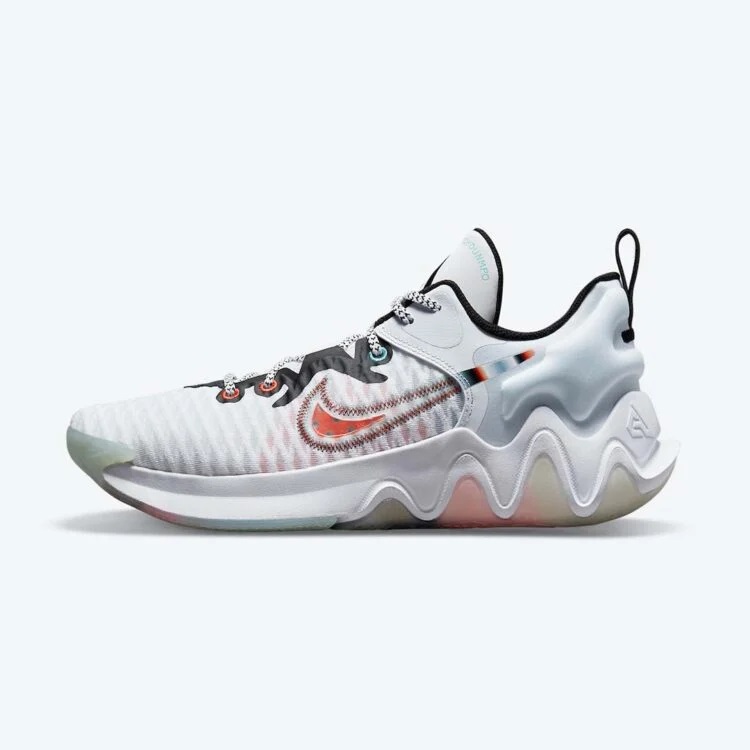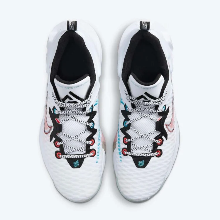 Sa base en mesh blanc à l’avant du pied évolue sur du rouge et du gris, avec un « swoosh » en rouge foncé et un autre, inversé, en turquoise. On retrouve des contours noirs sur les bords de la languette, le logo du « Greek Freak » sur la languette, où l’on retrouve aussi le nom de Giannis Antetokoumpo cousu en turquoise.
