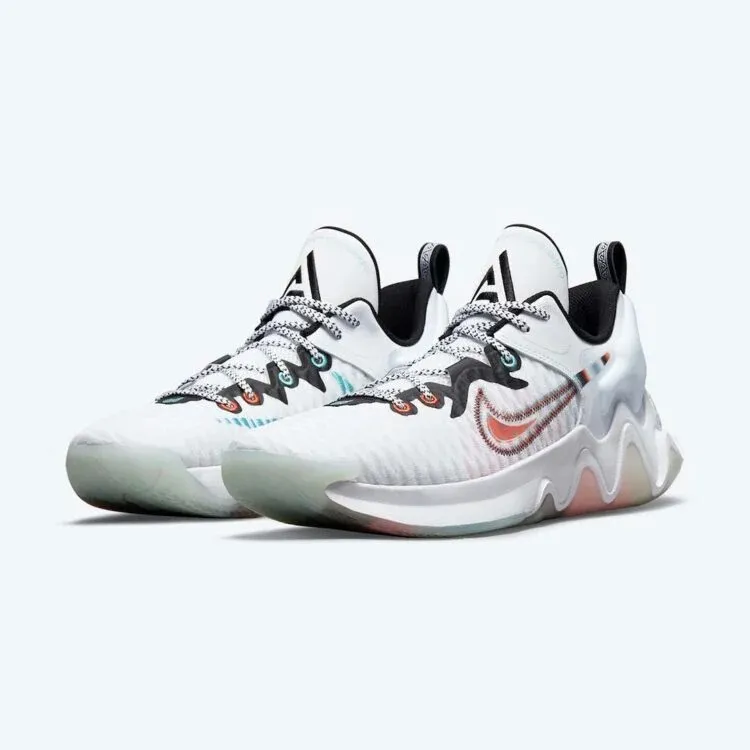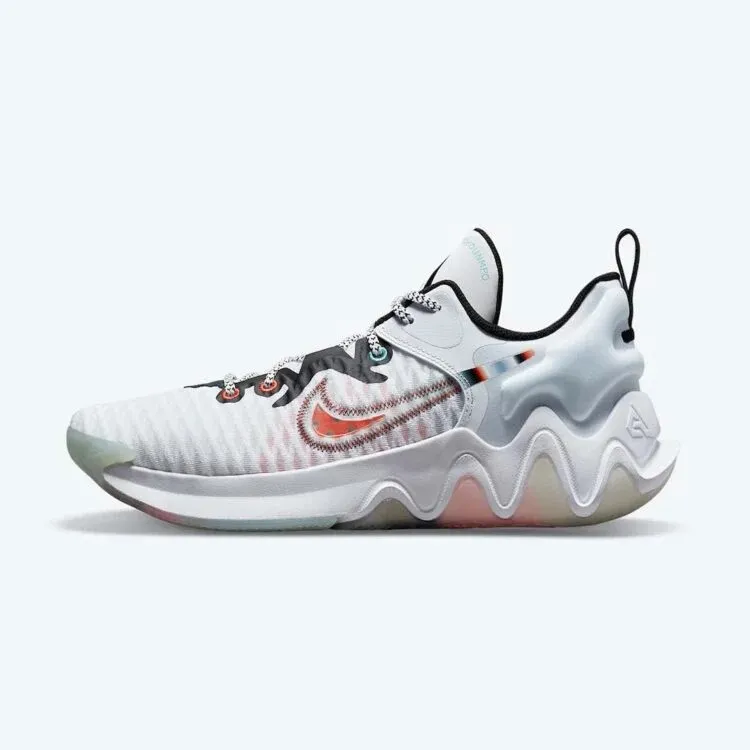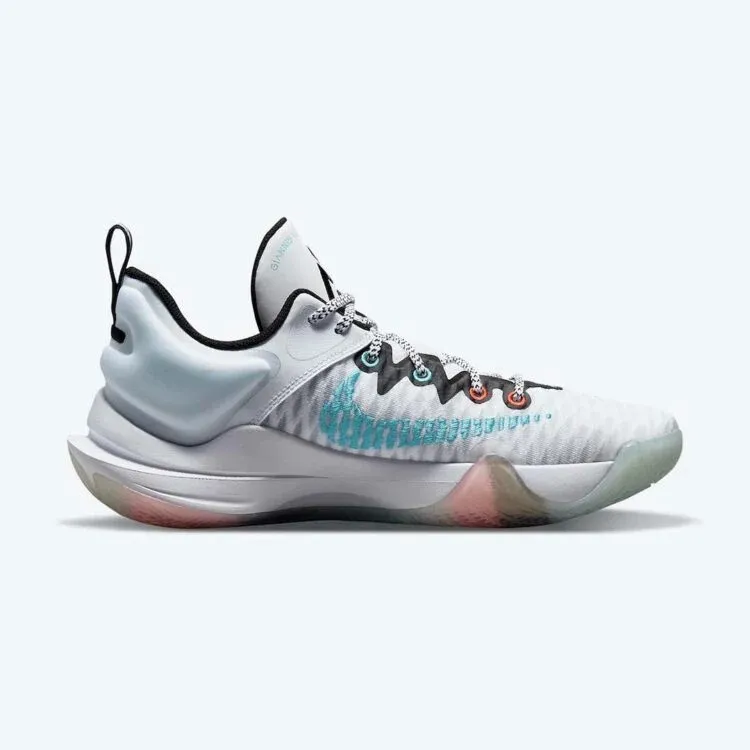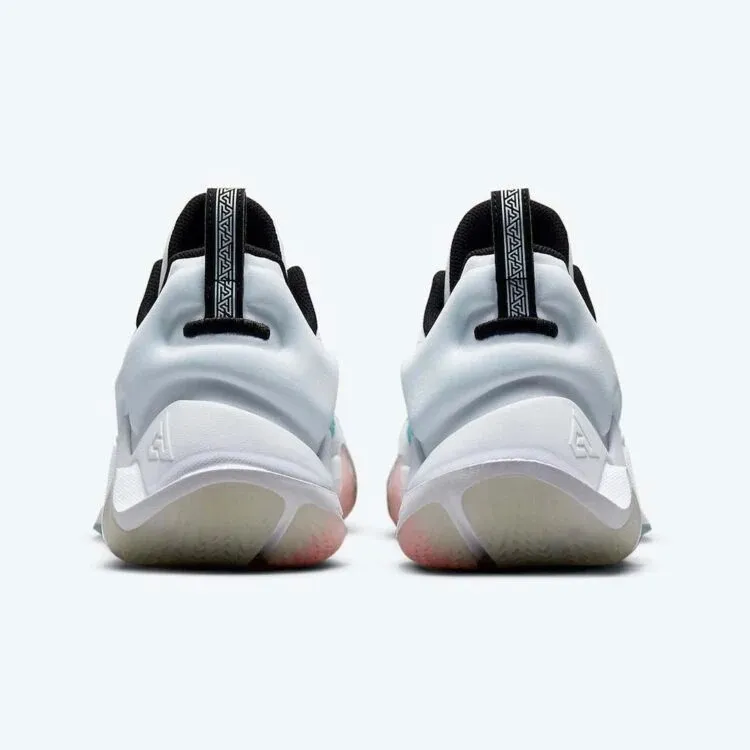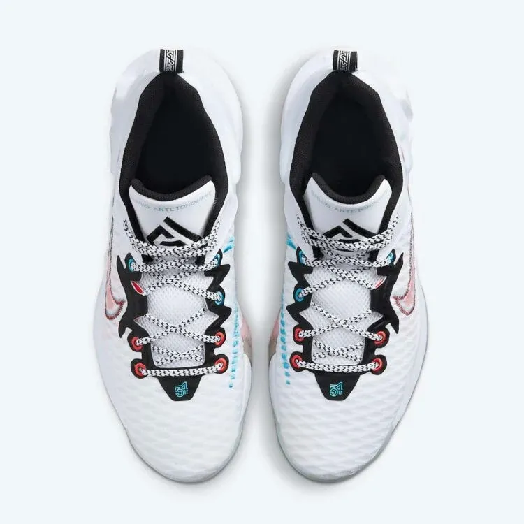 Sa base en mesh blanc à l'avant du pied évolue sur du rouge et du gris, avec un « swoosh » en rouge foncé et un autre, inversé, en turquoise. On retrouve des contours noirs sur les bords de la languette, le logo du « Greek Freak » sur la languette, où l'on retrouve aussi le nom de Giannis Antetokoumpo cousu en turquoise.