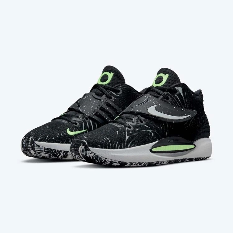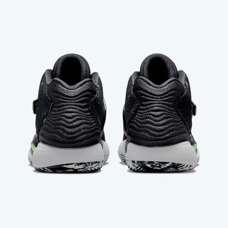 Dans la lignée de la « Bred », la nouvelle KD 14 reste sur une base noire, avec du gris pour remplacer le rouge, et des notes de « Volt », pour relever le tout. Celles-ci sont présentes sur la virgule Nike figurant à l’avant du pied, le logo « KD » ainsi que sur le « Zoom Air » visible au niveau de la semelle intermédiaire.