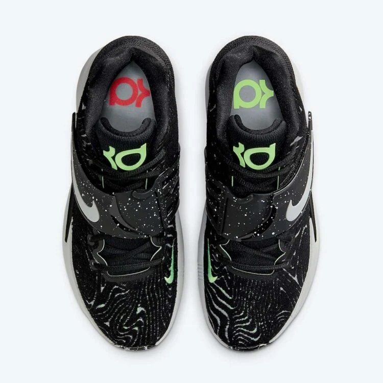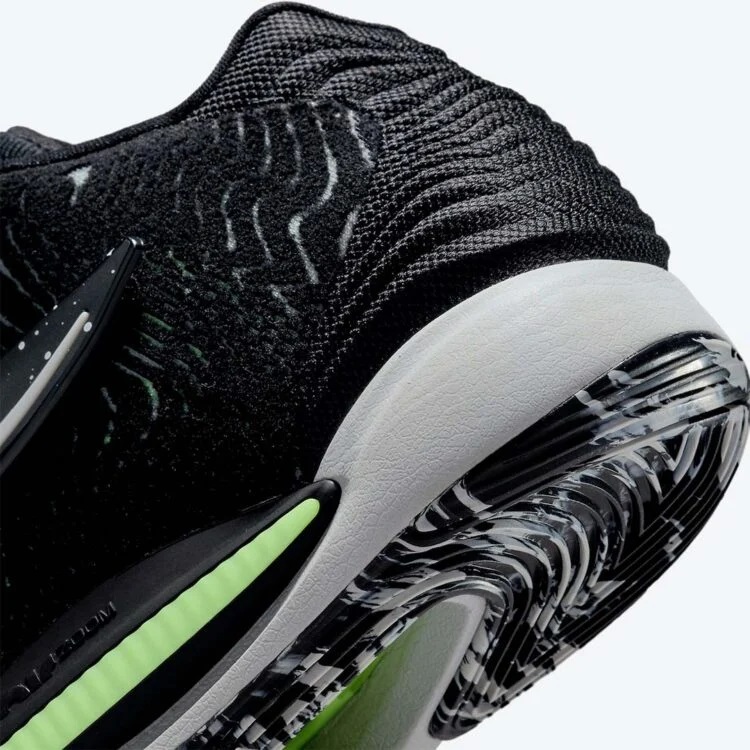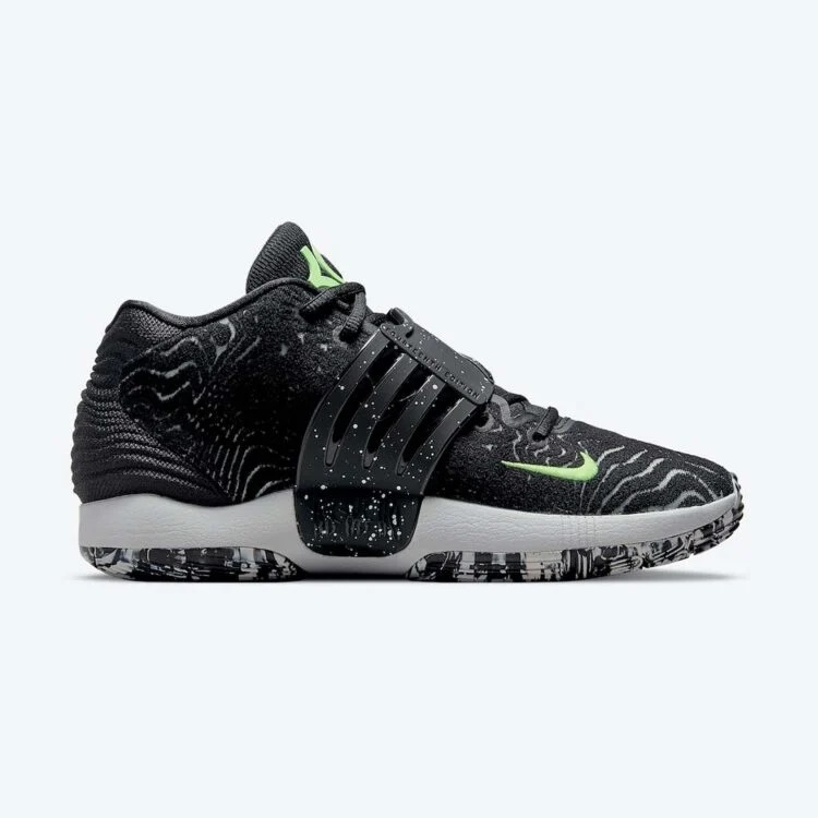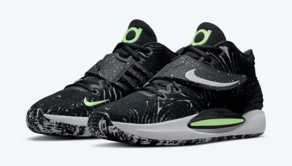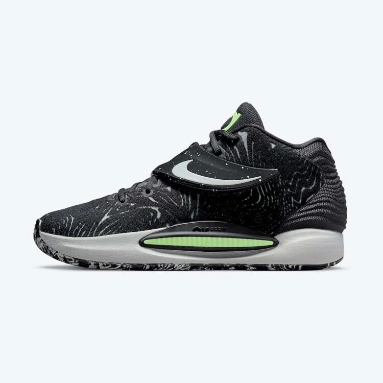 Dans la lignée de la « Bred », la nouvelle KD 14 reste sur une base noire, avec du gris pour remplacer le rouge, et des notes de « Volt », pour relever le tout. Celles-ci sont présentes sur la virgule Nike figurant à l’avant du pied, le logo « KD » ainsi que sur le « Zoom Air » visible au niveau de la semelle intermédiaire.