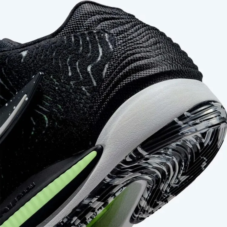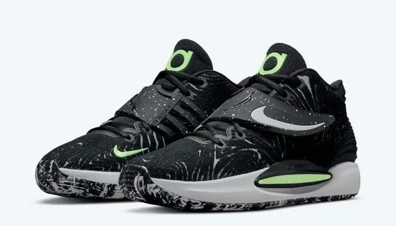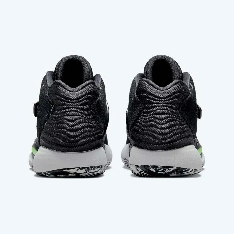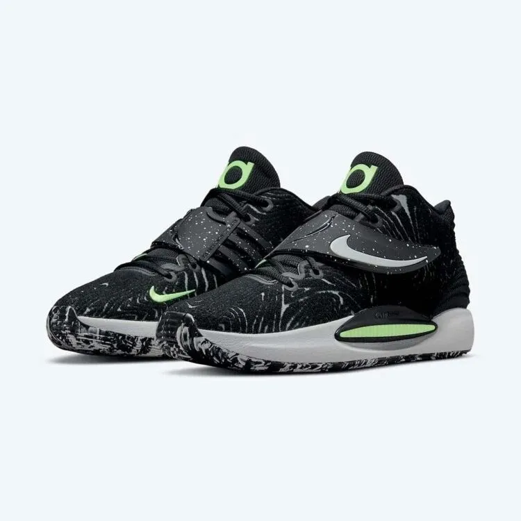 Dans la lignée de la « Bred », la nouvelle KD 14 reste sur une base noire, avec du gris pour remplacer le rouge, et des notes de « Volt », pour relever le tout. Celles-ci sont présentes sur la virgule Nike figurant à l'avant du pied, le logo « KD » ainsi que sur le « Zoom Air » visible au niveau de la semelle intermédiaire.