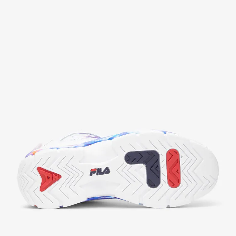 Avec une base en cuir blanc et des détails « Tie-Dye » colorés pour entourer l'empeigne de chaque côté de la chaussure, traversant notamment le logo « FILA » en blanc. A noter la présence de la sangle présente au niveau du talon et d'une languette en maille. Le code couleur classique de la marque allemande (bleu marine et rouge) se trouve sous la semelle.