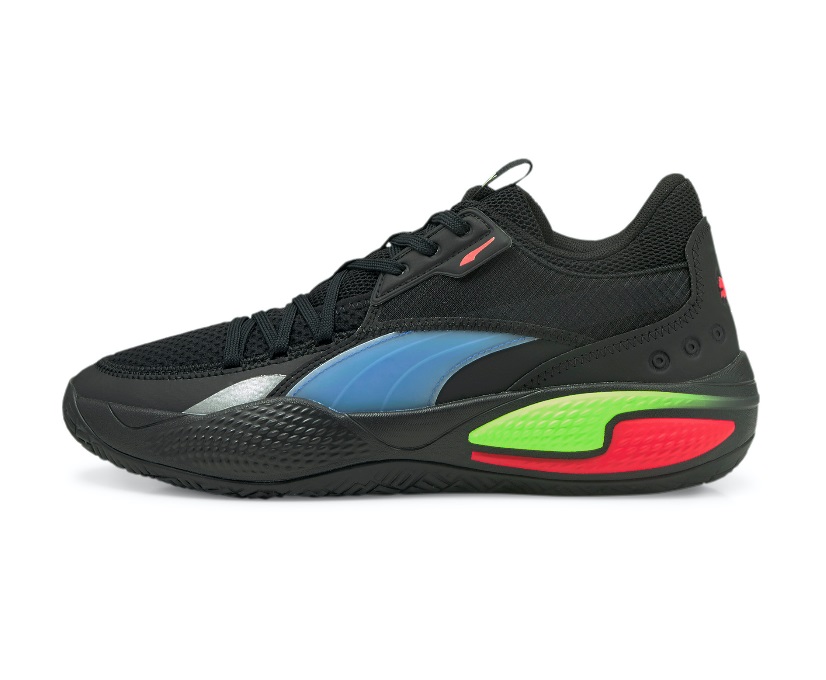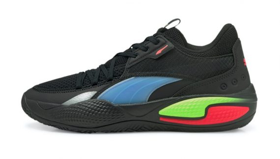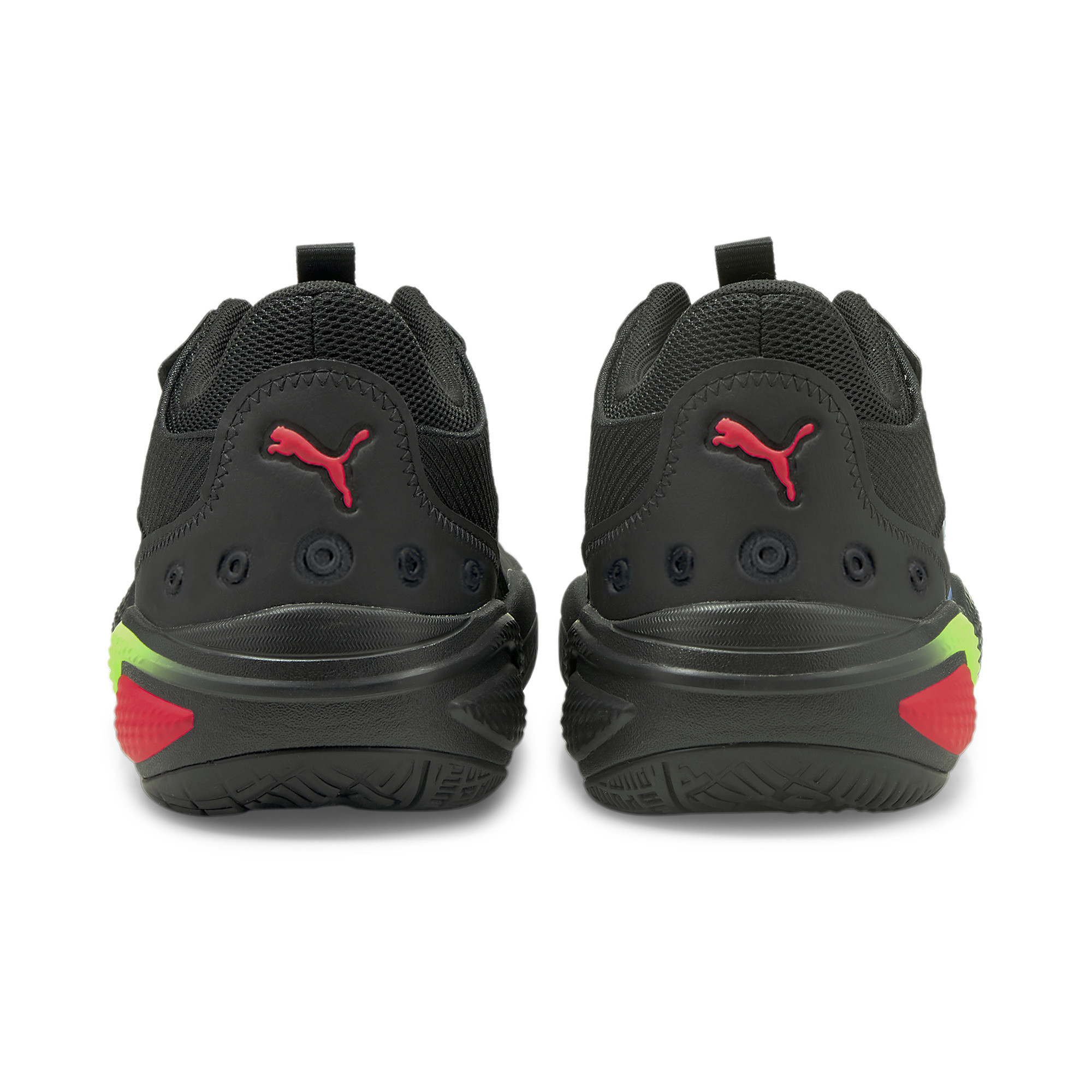 Les marques vertes et rouges s’imbriquent au niveau de l’arrière de la semelle intermédiaire, tandis que la marque bleue apparaît sur l’empeigne. Le logo Puma, présent sur le talon, est également en rouge.