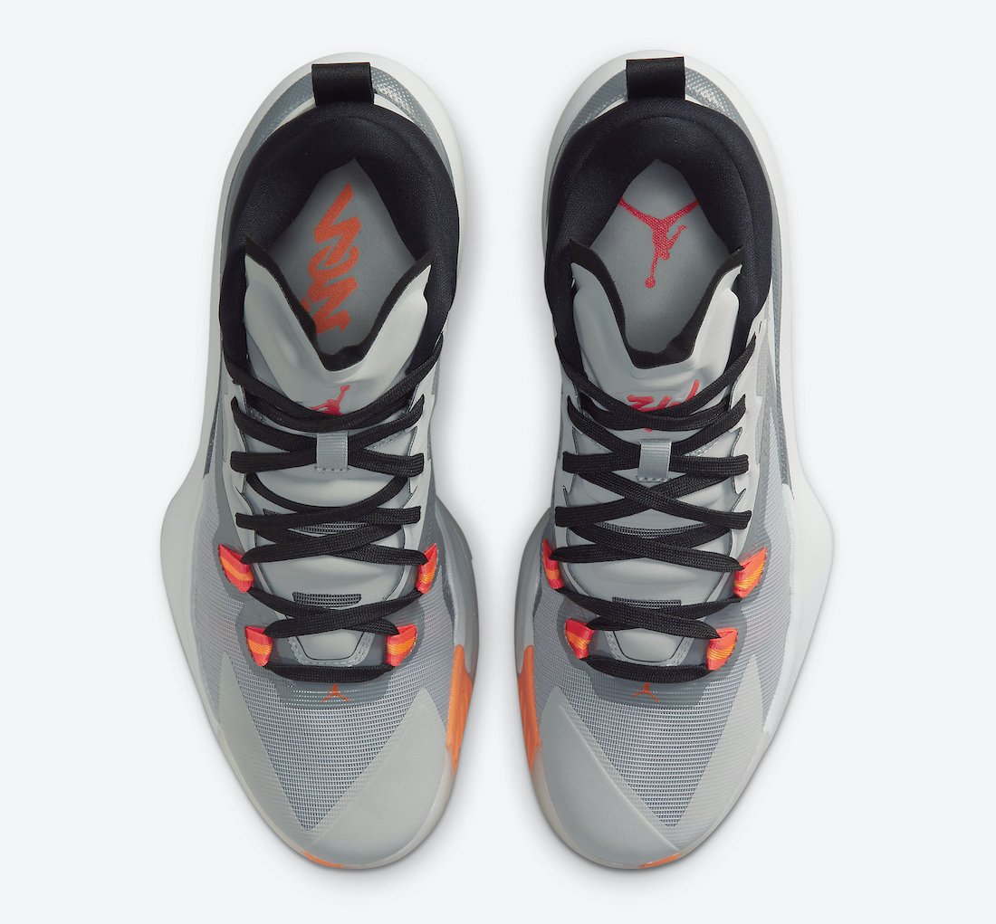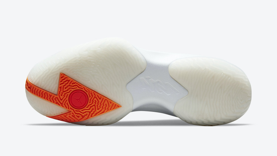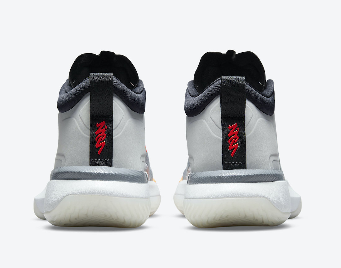 Celle-ci est traversée par deux bandes d’orange à l’avant du pied. La sangle également présente à l’avant du pied, ainsi que les logos de Zion Williamson et Jordan Brand, sur la languette et le talon, ressortent aussi en orange.