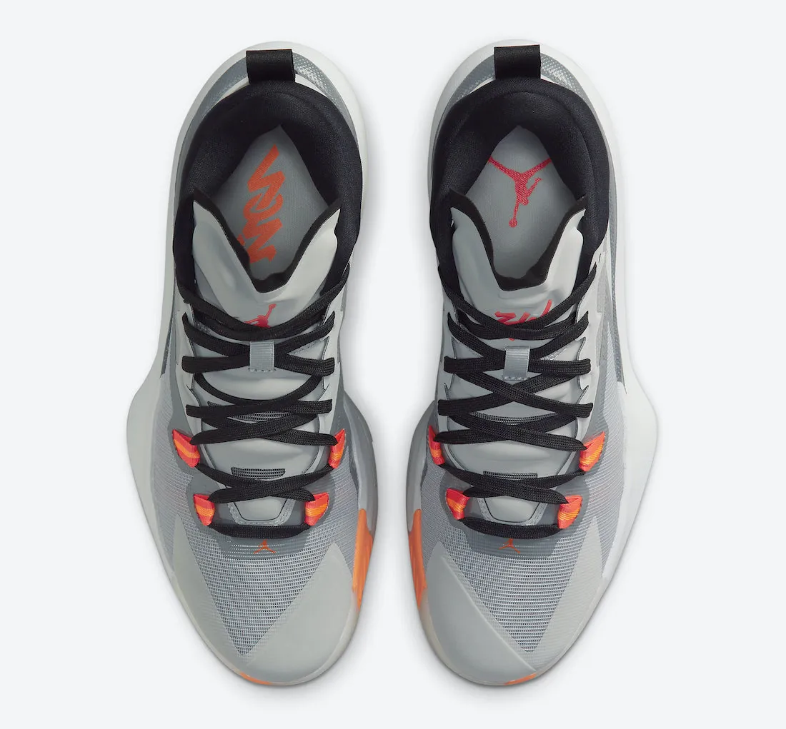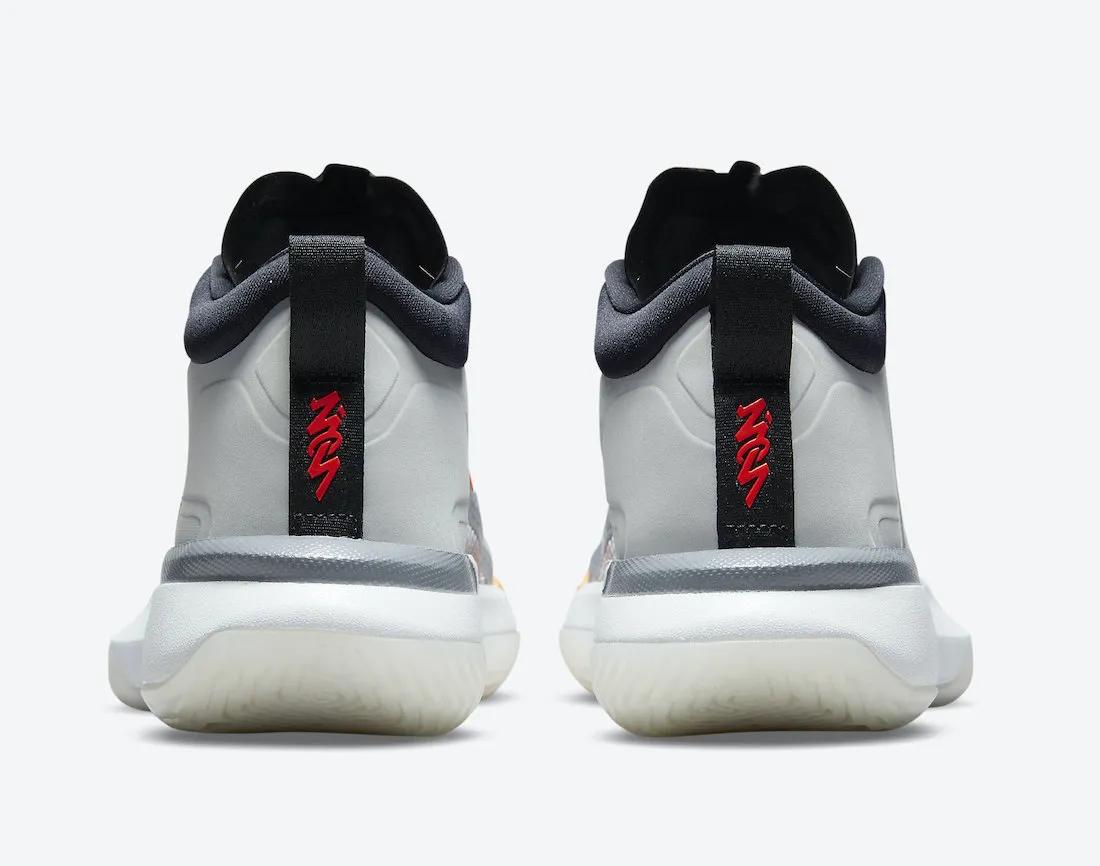 Celle-ci est traversée par deux bandes d'orange à l'avant du pied. La sangle également présente à l'avant du pied, ainsi que les logos de Zion Williamson et Jordan Brand, sur la languette et le talon, ressortent aussi en orange.