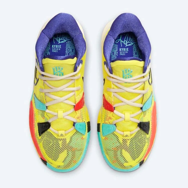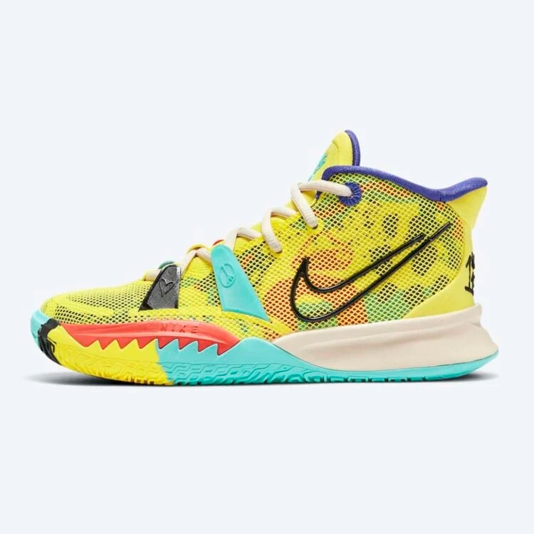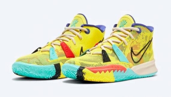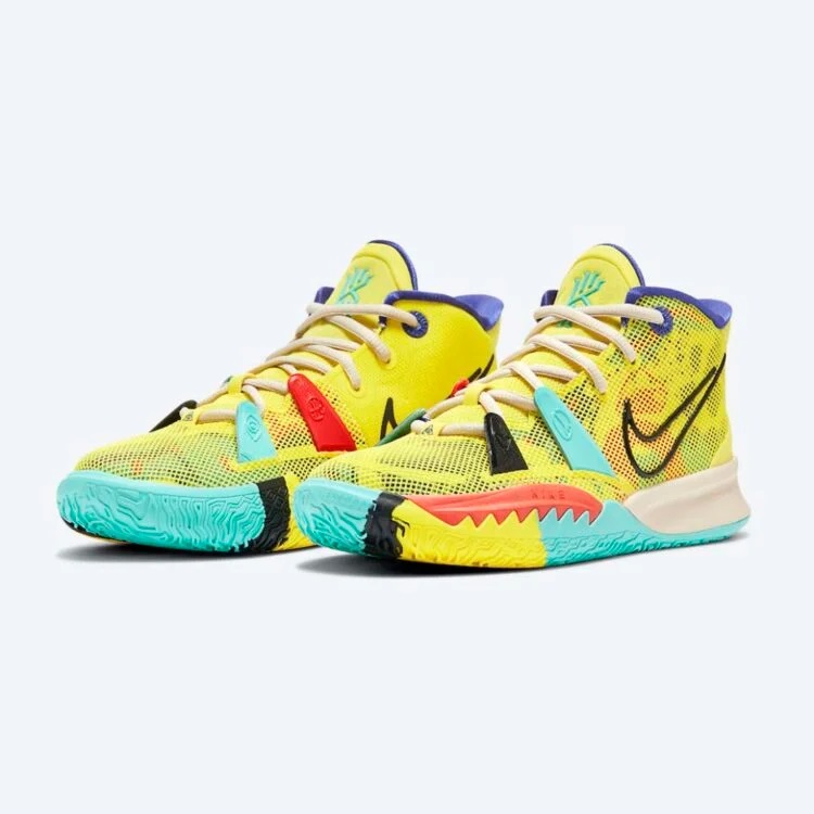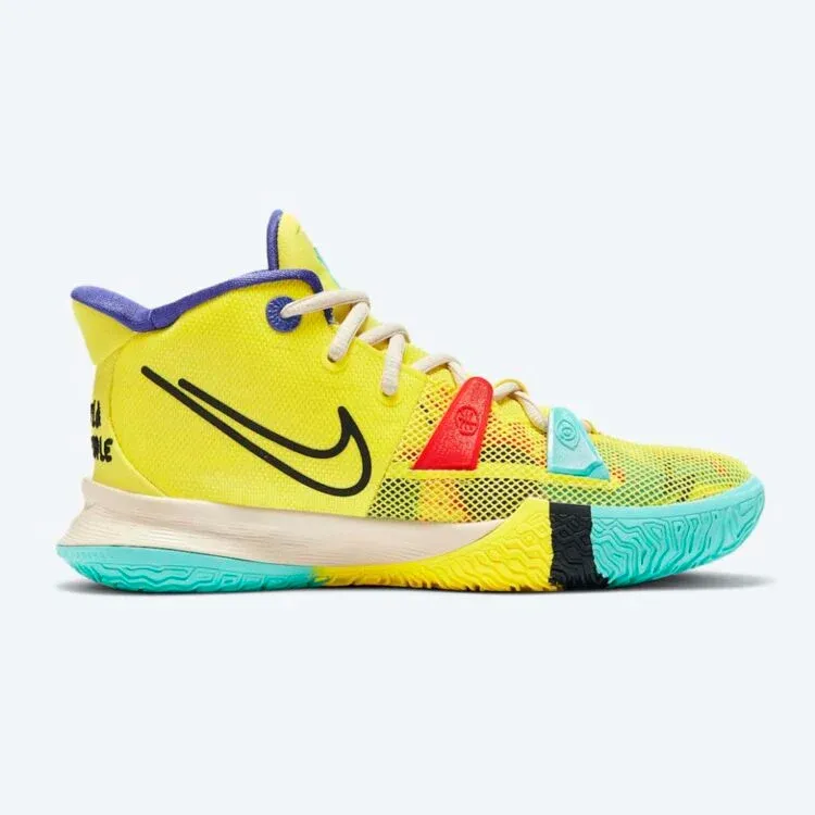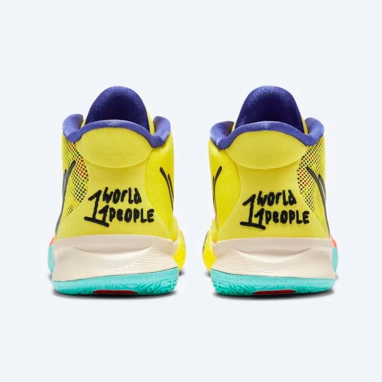 Après avoir dévoilé un modèle beige et bleu, la collection « 1 World 1 People » se dote d'une nouvelle Kyrie 7, avec cette fois un coloris à dominante jaune, teintée de noir, bleu et rouge, tandis que l'intérieur du col est en violet.