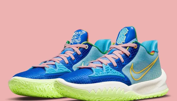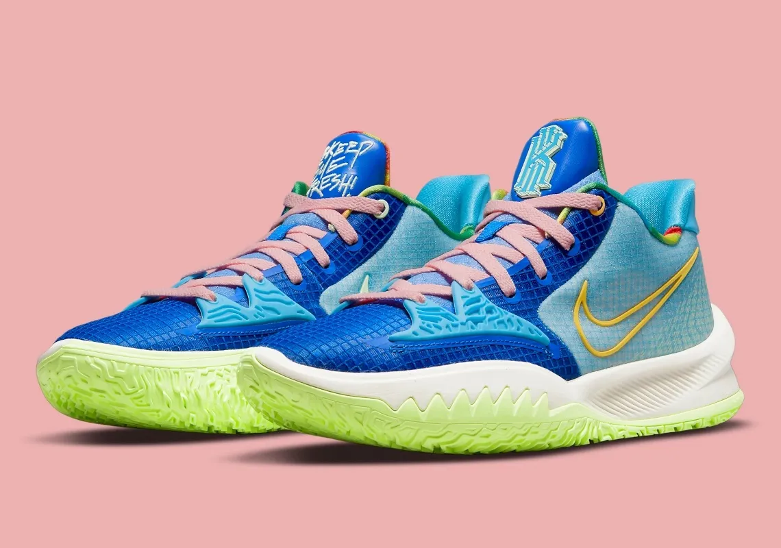 Cette fois, c'est un nouveau coloris qui s'apprête à investir le marché, sur le modèle d'une Kyrie 4 Low (reprenant le design… de la 7, en version low). Une version où on retrouve plusieurs couleurs, avec une empeigne mêlant trois teintes de bleu, foncé, pâle et turquoise, une semelle extérieure en vert clair et une semelle intermédiaire en blanc. Les contours du signe Nike apparaissent en jaune d'un côté et en vert clair de l'autre, tandis que les lacets ressortent en rose, sans oublier la touche de « Weatherman » au niveau du col.
