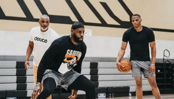 Après un modèle « Toon » mêlé d'orange et de bleu, c'est une version plus classique de la LeBron 19 qui a été divulguée sur les réseaux du King, à l'occasion d'une séance d'entraînement en compagnie de Russell Westbrook, quant à lui chaussé de « Why Not Zer0.4 » aux couleurs des… Wizards.