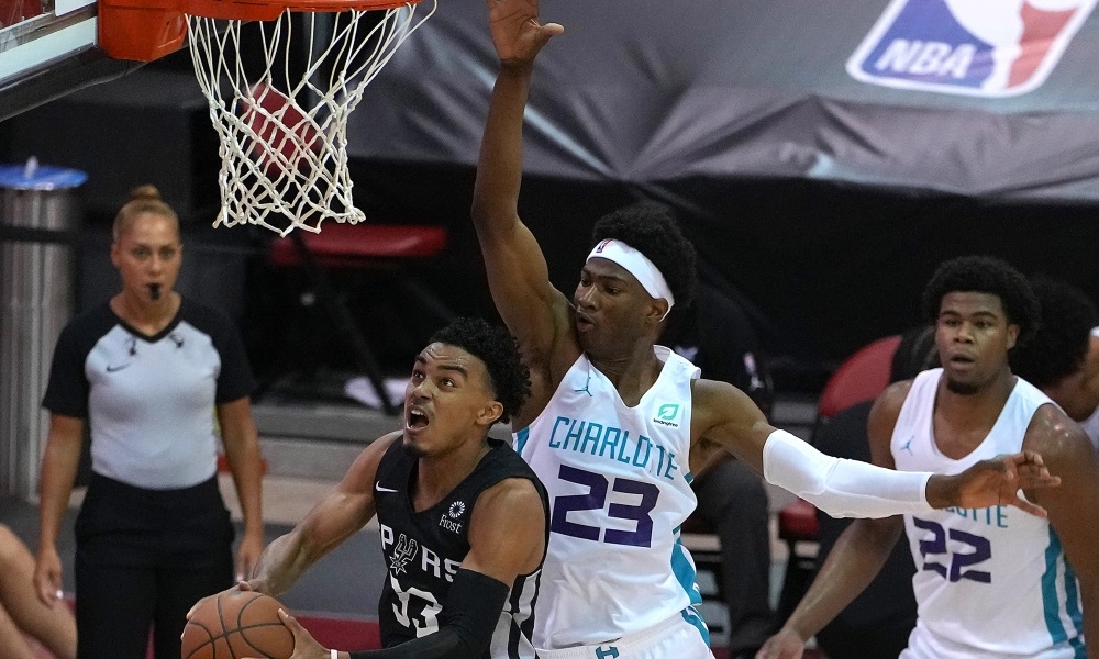 Kai Jones a connu la lumière de l’exposition médiatique avec ce dunk en haute altitude asséné par dessus Kenneth Faried dès son premier match de Summer League. Le rookie des Hornets avait de quoi « buzzer » avec une telle action, et il s’est globalement distingué par son côté spectaculaire.