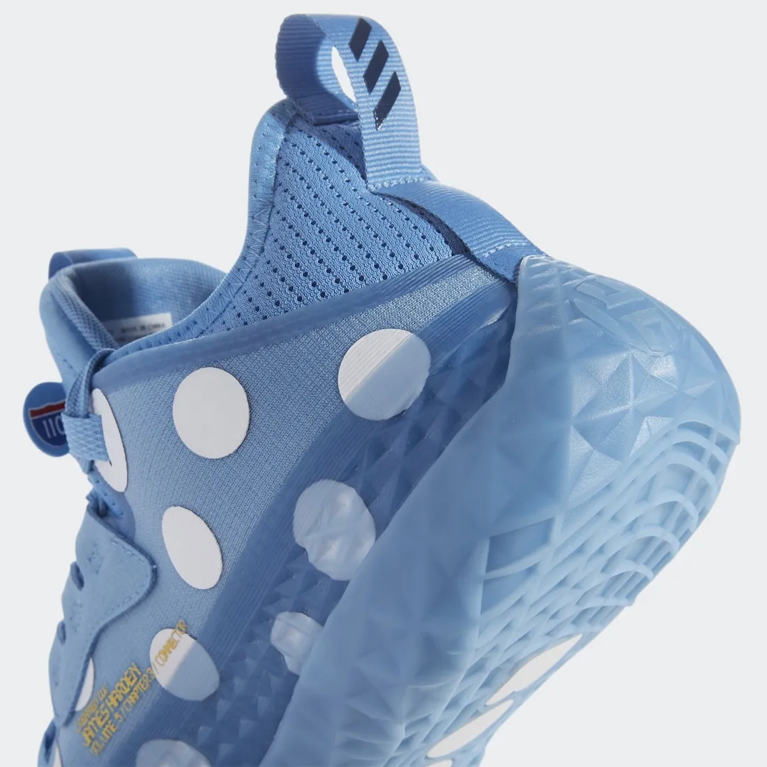 Disponible sur un coloris noir à pois blanc en France, la Harden Vol.5 FutureNatural a été déclinée dans une nouvelle version, déjà à la vente sur le territoire américain. Le principe reste le même, avec une couleur principale, du bleu clair en l'occurrence, coloris qui peut faire penser au modèle bleu et rouge du maillot rétro des Nets, et donc la présence des pois blancs pour recouvrir l'intégralité de la tige et qu'on retrouve même sous la semelle.