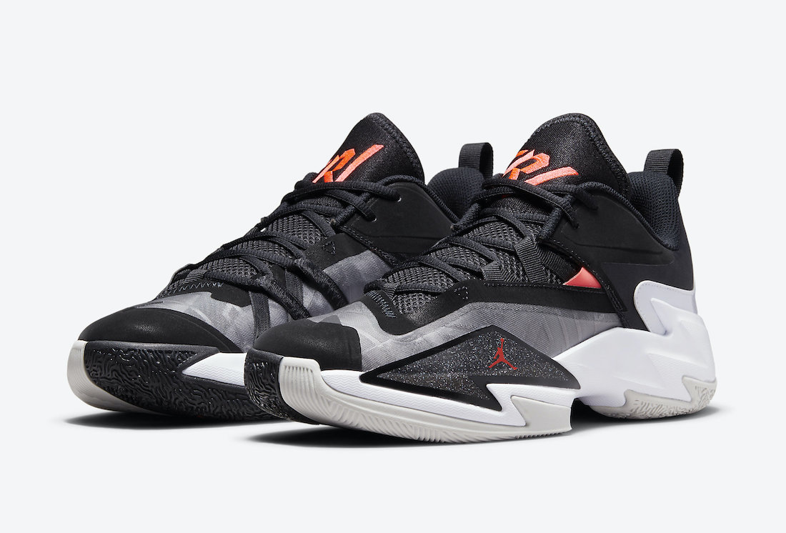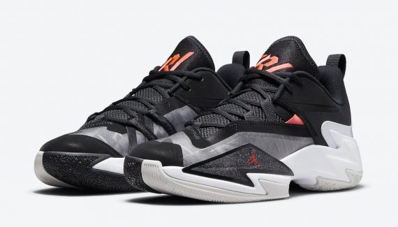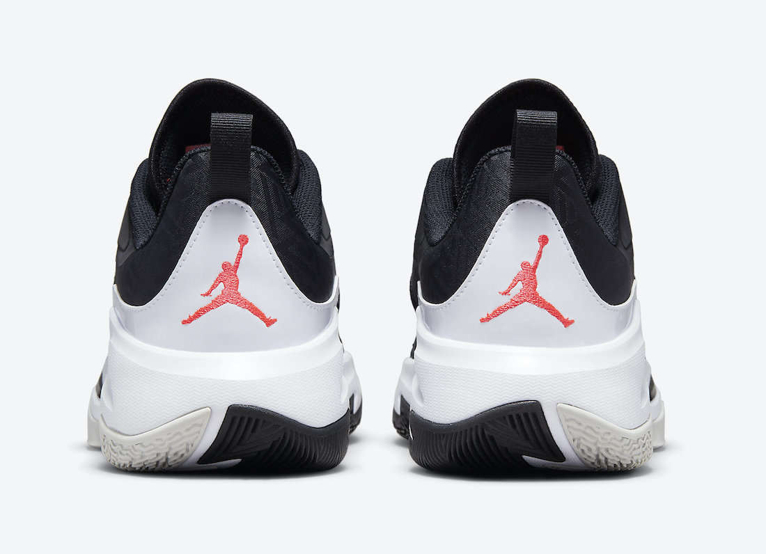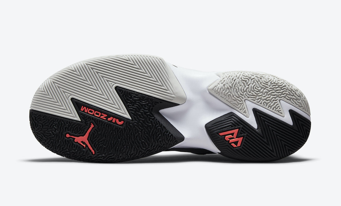 Sur ce coloris noir, gris et blanc, on distingue une base en mesh superposée de bandes synthétiques. La semelle intermédiaire, sur laquelle repose une unité Zoom Air à l’avant du pied, fait ressortir des formes d’éclair, comme sur la zone en gris tacheté sur laquelle se trouve le “Jumpman” en rouge, également présent sur le talon, ou même sous la semelle. Quelques autres accents de rouge complètent l’ensemble.