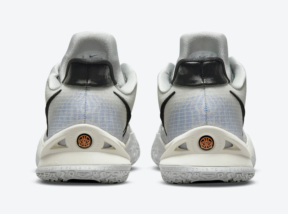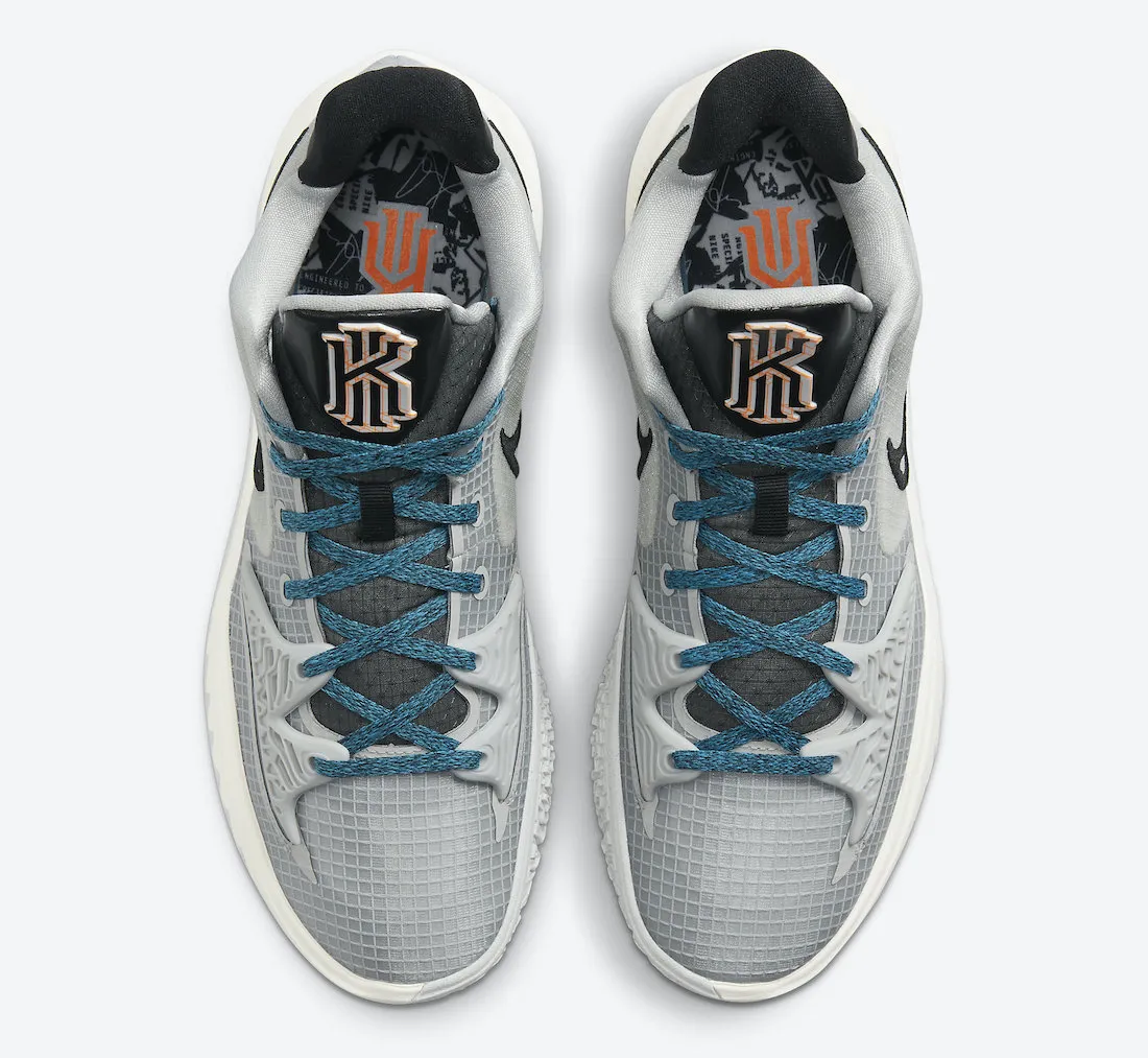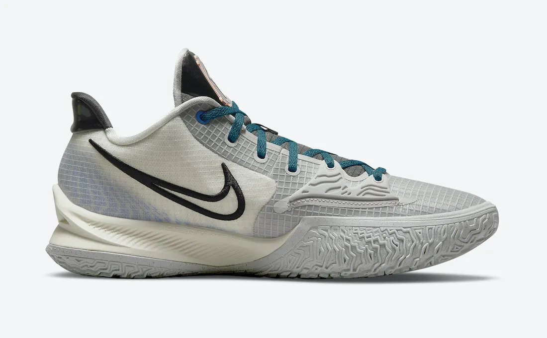 Celui-ci offre une nouvelle combinaison de couleurs, autour du blanc cassé-gris, similaire au parquet des Nets récemment rénové. Les contours du « Swoosh » apparaissent en noir, tandis que les lacets ressortent en bleu. Autre petite touche d'originalité sur la languette, le logo de Kyrie Irving, tacheté d'orange.