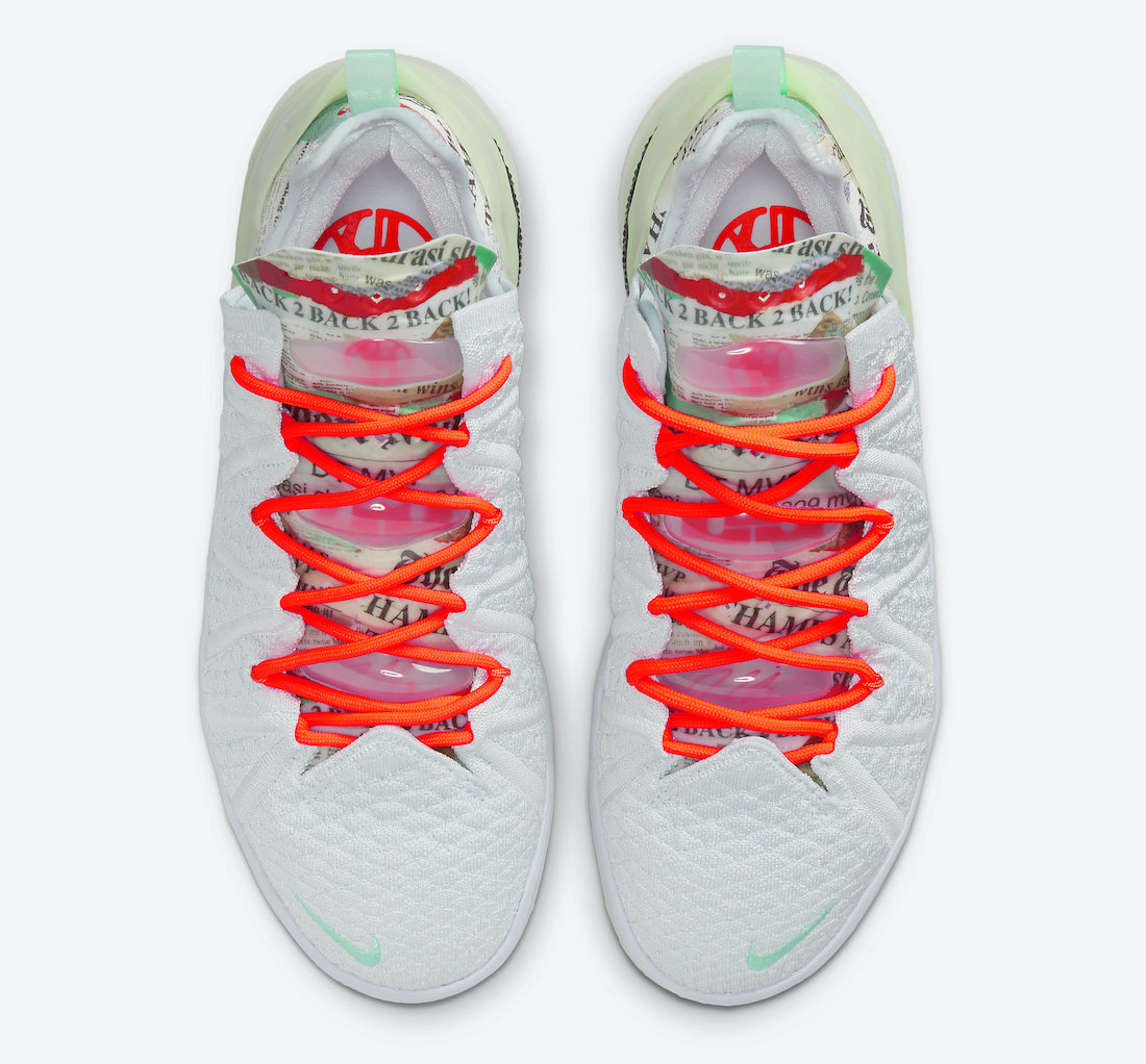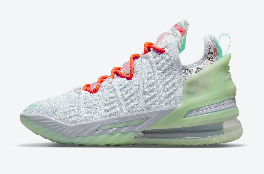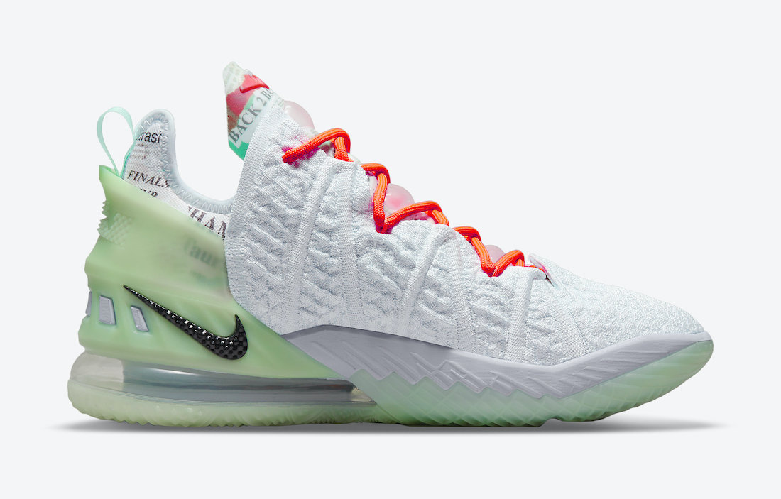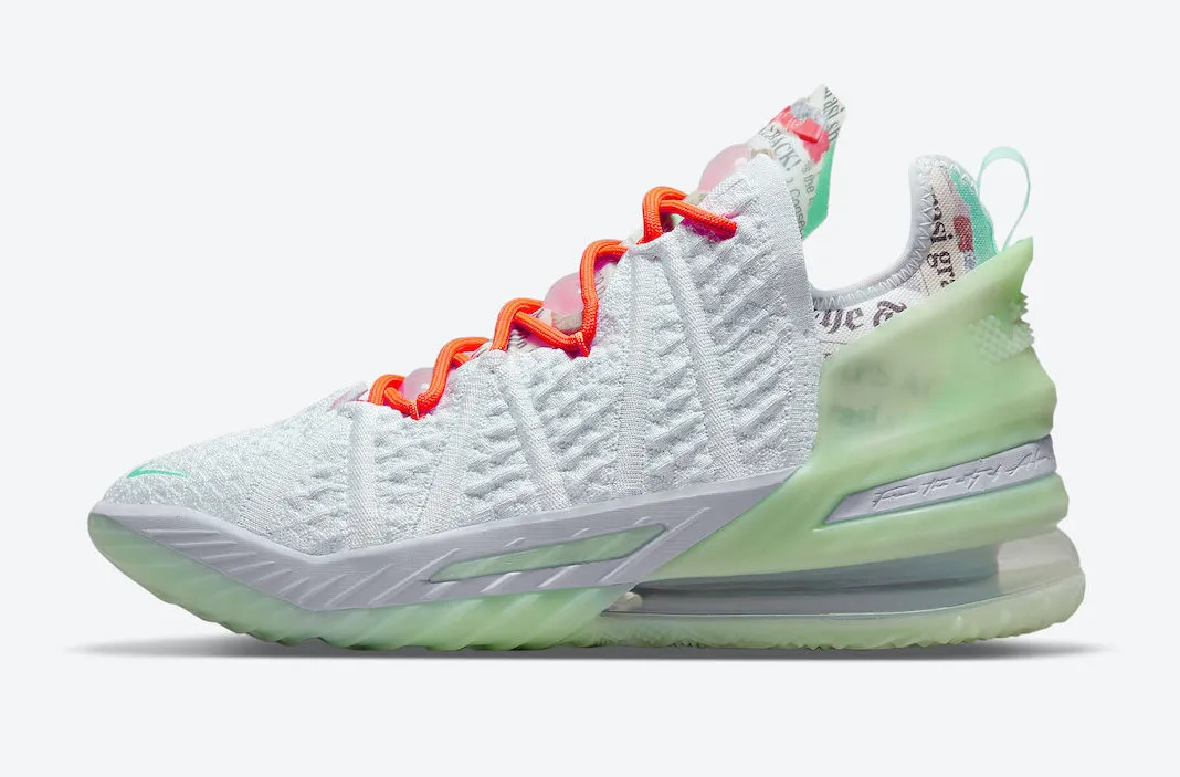 Avec une tige blanche, complétée par un talon moulé vert fluo semi-translucide et une semelle extérieure assortie. Les lacets et les détails sur la languette sont orange vif.
