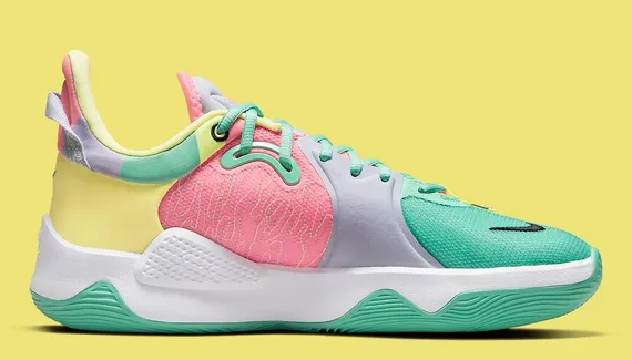 La PG 5 a aussi son petit succès sur les parquets, et va continuer de se démarquer en proposant cette fois un modèle original, très coloré, sur le thème des couleurs pastel, en vert, jaune, rose et violet.