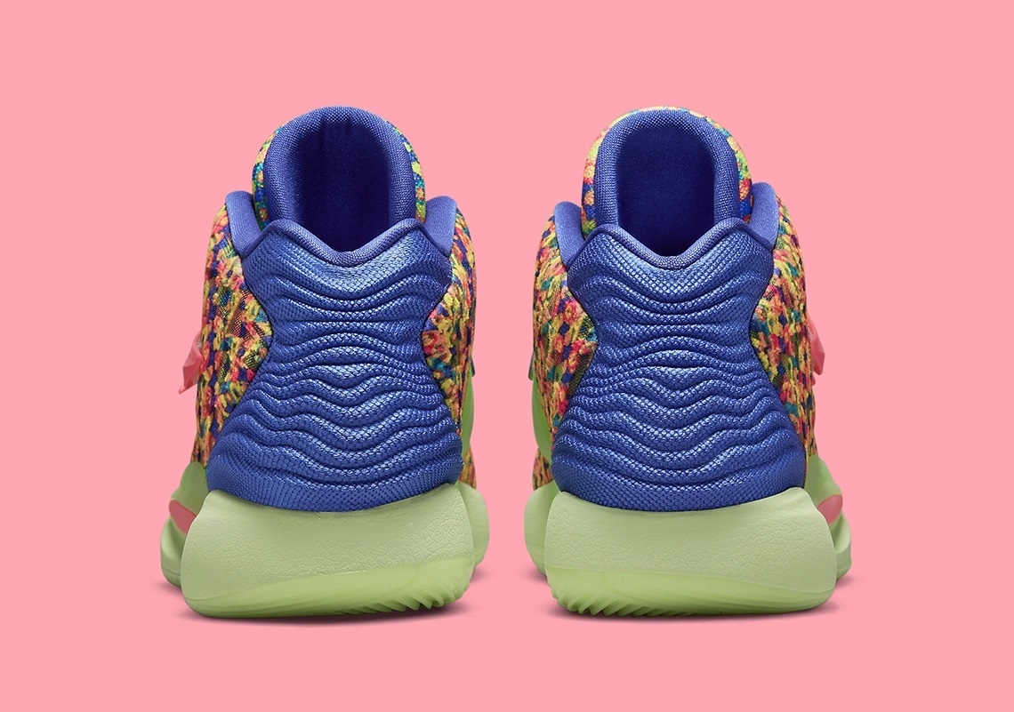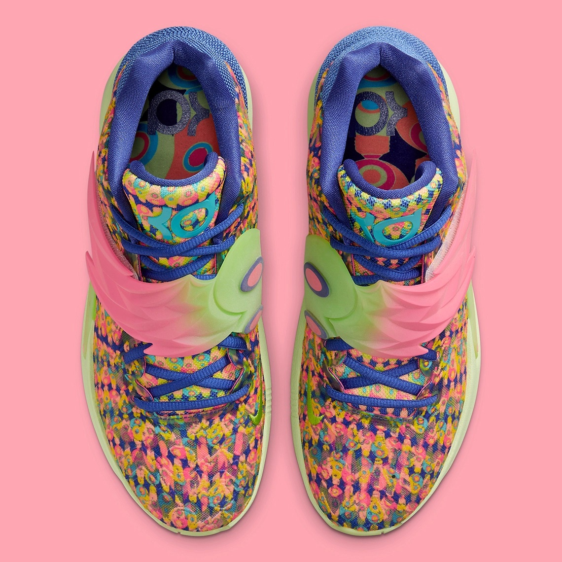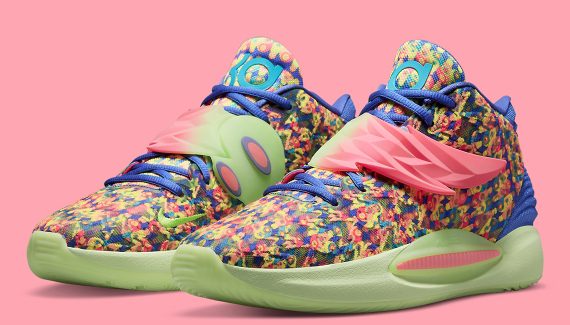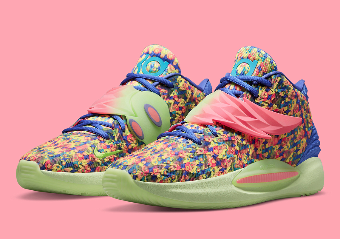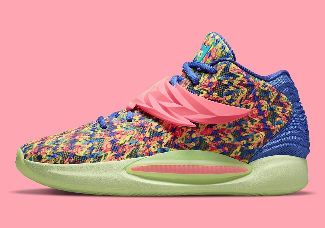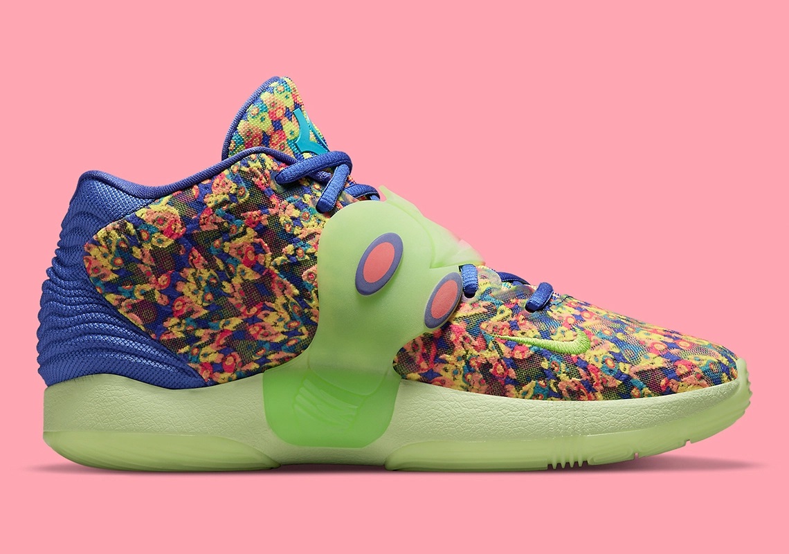 Attention les yeux ! Nike s’apprête encore à montrer sa maîtrise du contre-pied avec une nouvelle KD 14 qui fait dans le bariolé. Avec des motifs psychédéliques (également comparables à… un papier-peint floral rétro) pour recouvrir sa tige et une sangle épurée qui ressort avec un dégradé de rose et et vert translucide (appelé « Volt »), assemblement qu’on recouvre également au niveau de la semelle, principalement verte, tout comme le « Swoosh » sur l’avant de la chaussure droite.
