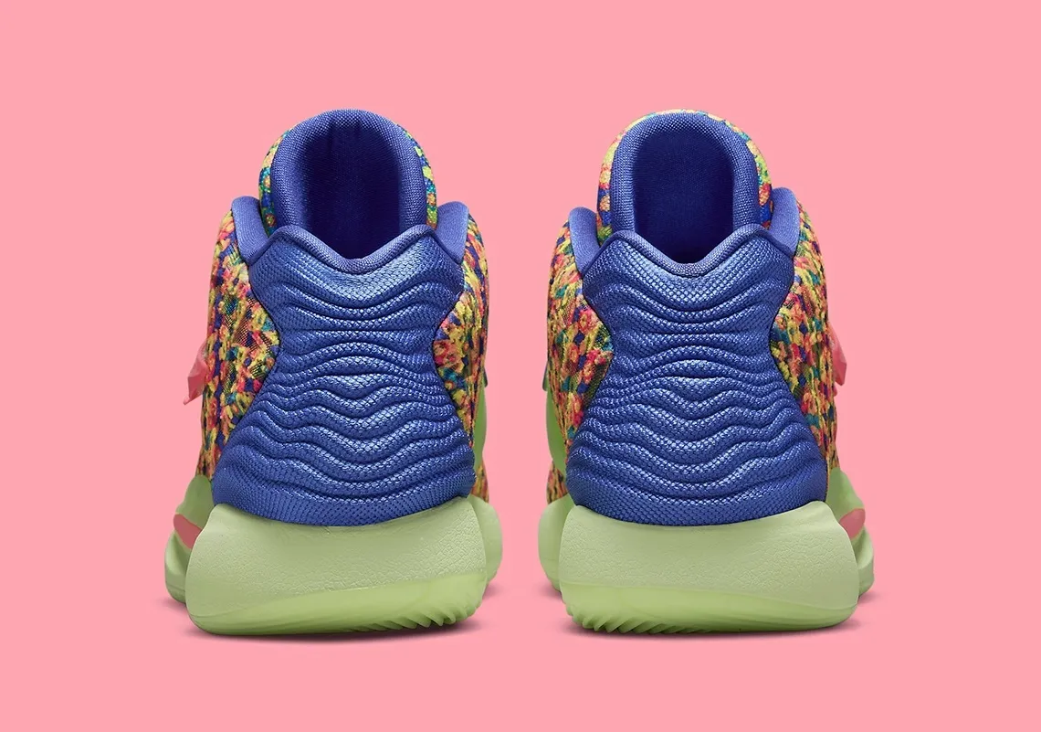 Attention les yeux ! Nike s'apprête encore à montrer sa maîtrise du contre-pied avec une nouvelle KD 14 qui fait dans le bariolé. Avec des motifs psychédéliques (également comparables à… un papier-peint floral rétro) pour recouvrir sa tige et une sangle épurée qui ressort avec un dégradé de rose et et vert translucide (appelé « Volt »), assemblement qu'on recouvre également au niveau de la semelle, principalement verte, tout comme le « Swoosh » sur l'avant de la chaussure droite.