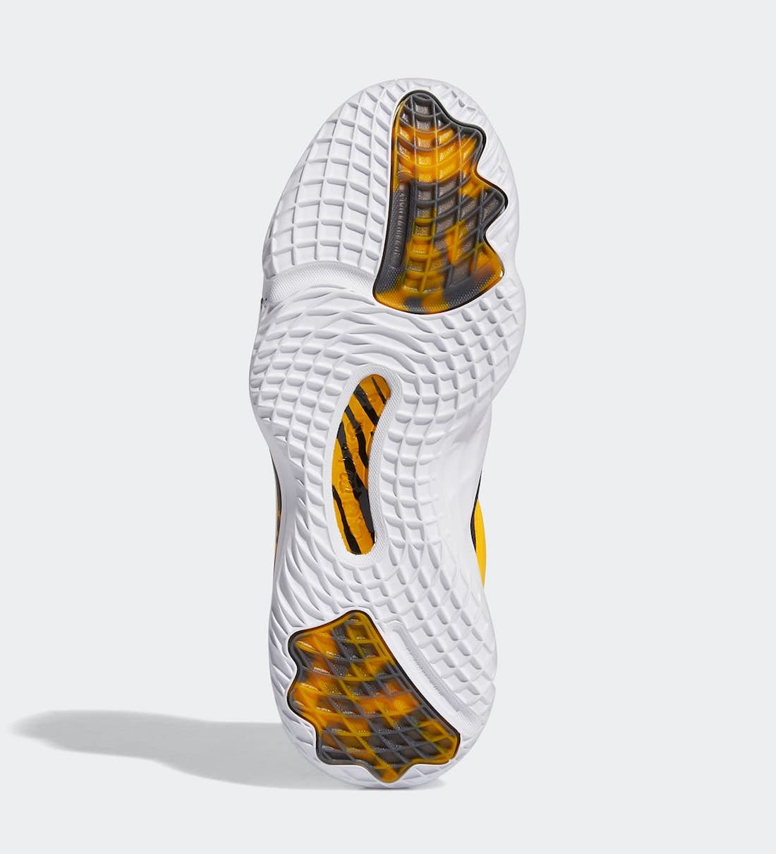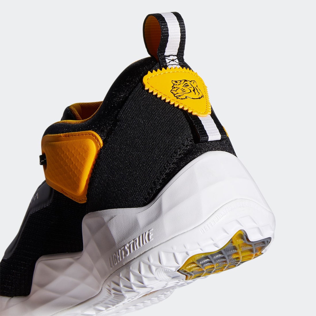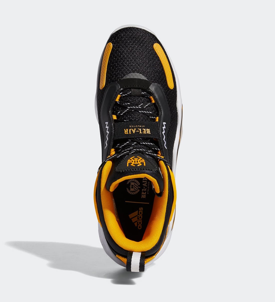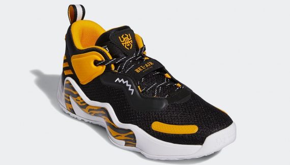 La tige est donc principalement noire, recouverte de bandes jaunes dont le logo d’adidas au niveau du talon. La semelle intermédiaire, blanche, laisse pour sa part échapper un motif tigré, en clin d’œil à la mascotte de l’équipe, dont le logo est présent sur le talon. Le logo « Spida », de Donovan Mitchell apparaît quant à lui sur la languette. Enfin, on peut lire « Bel-Air Athletics » sur une bande recouvrant une partie des lacets.
