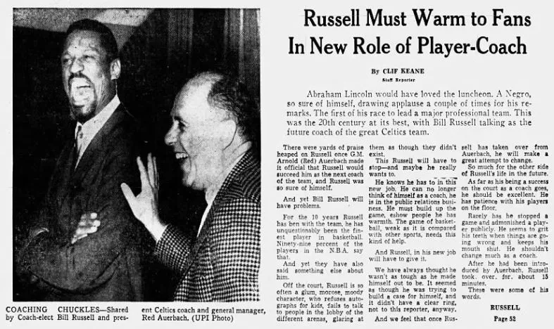 “Lorsque j'ai été nommé entraîneur des Celtics, les joueurs m'ont accepté sans le moindre conflit”, expliquera Bill Russell quelques années plus tard. “Ils me respectaient en tant que joueur et pour ma connaissance du jeu et ils se donnaient autant à fond pour moi qu'ils le faisaient pour Red Auerbach”.