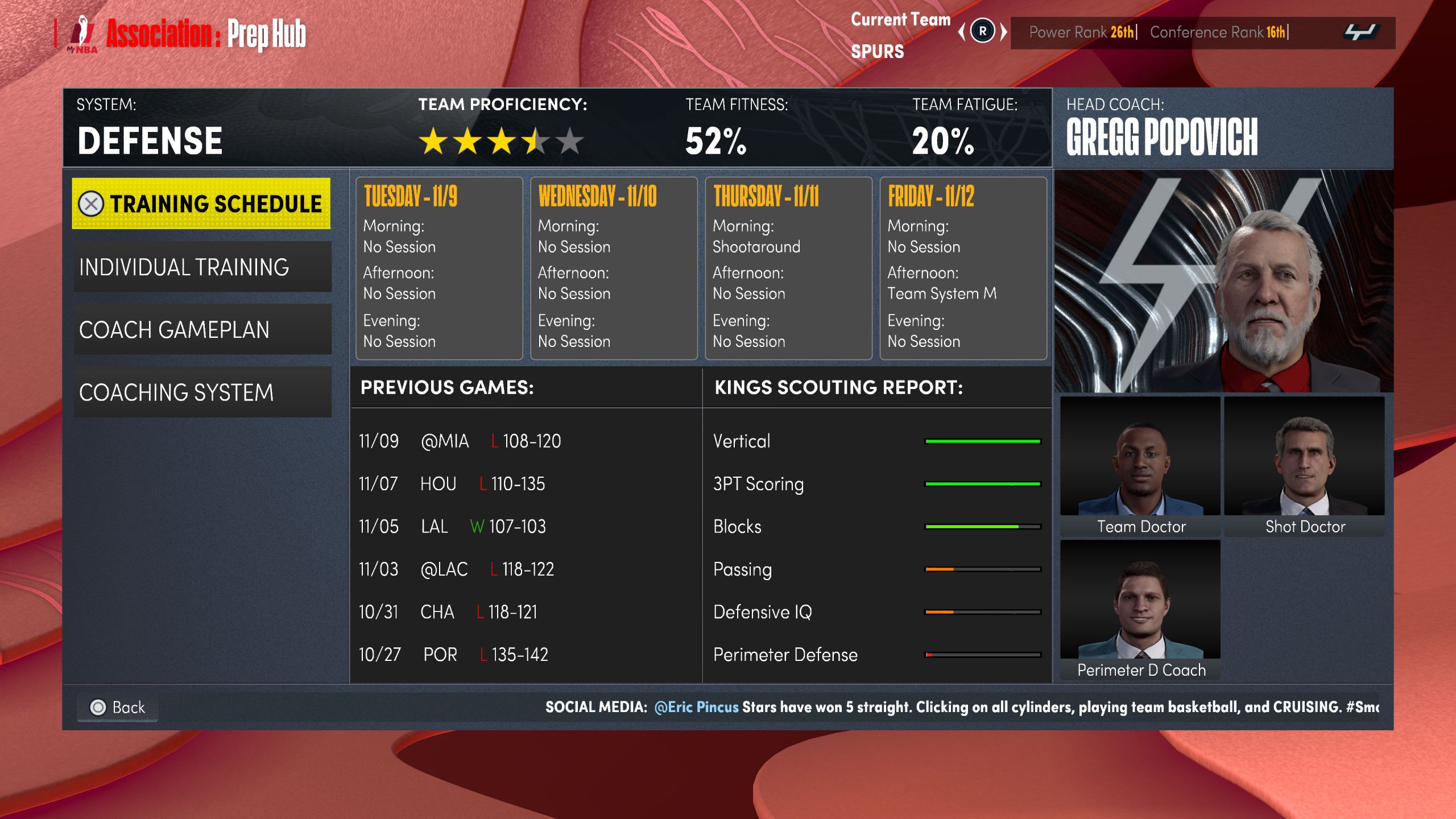 Parmi les éléments qui vont gagner en importance dans la progression de votre équipe, le staff de votre équipe prend de l’ampleur, avec au total 17 membres à nommer, répartis en plusieurs catégories : front office (Président, MG, Assistant MG, Directeur financier), coaching (Coach en chef, Spécialiste du shoot, Coach Intérieurs, Coach de défense au poste, Coach de défense extérieure, Spécialiste des arrières, Spécialiste des ailiers), recherche de talents (Recruteur en chef, quatre recruteurs nationaux, deux recruteurs internationaux) et médecine du sport (Médecin de l’équipe, Spécialiste en puissance, Spécialiste en endurance, Préparateur mental, Science du sport, Kiné, Spécialiste du sommeil).