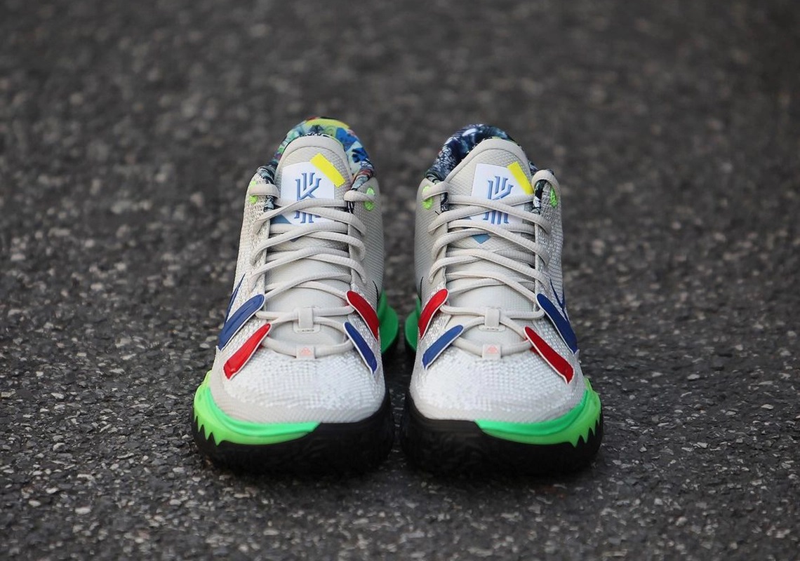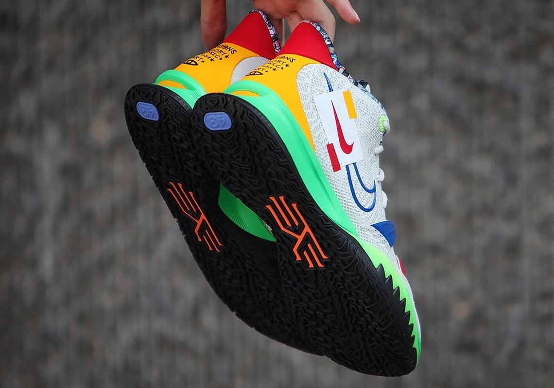 Cette fois, ce sont les passions de Kyrie Irving qui ont été mises à l’honneur à travers ce coloris « Visions », alliant une tige blanche en mesh teintée de marques bleues et rouges, sur quatre accroches des lacets et pour faire ressortir les deux logos Nike superposés. Les mentions « Visions, Sport, Musix, Art, Cinema » apparaissent sur le talon, en noir sur fond jaune, le tout reposant sur une semelle intermédiaire « vert néon vif ».