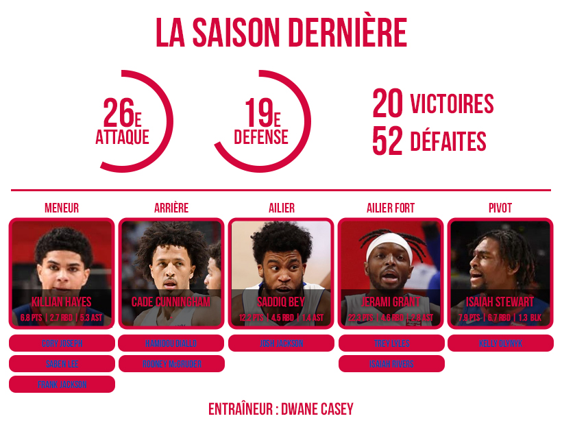 Aux côtés de ces quelques éléments d’expérience, auxquels il faut ajouter Rodney McGruder (30 ans), c’est une classe biberon. Avec notamment les désormais deuxième année, Killian Hayes, Isaiah Stewart et Saddiq Bey, mais aussi la venue du 1er choix de la Draft 2021, Cade Cunningham.
