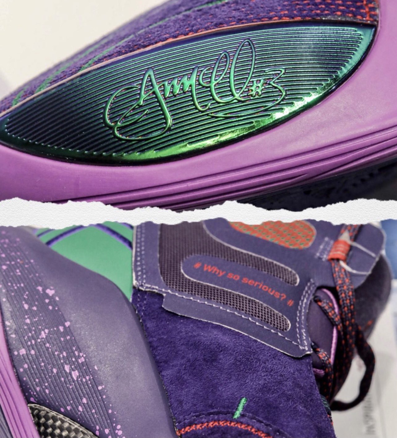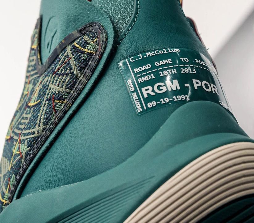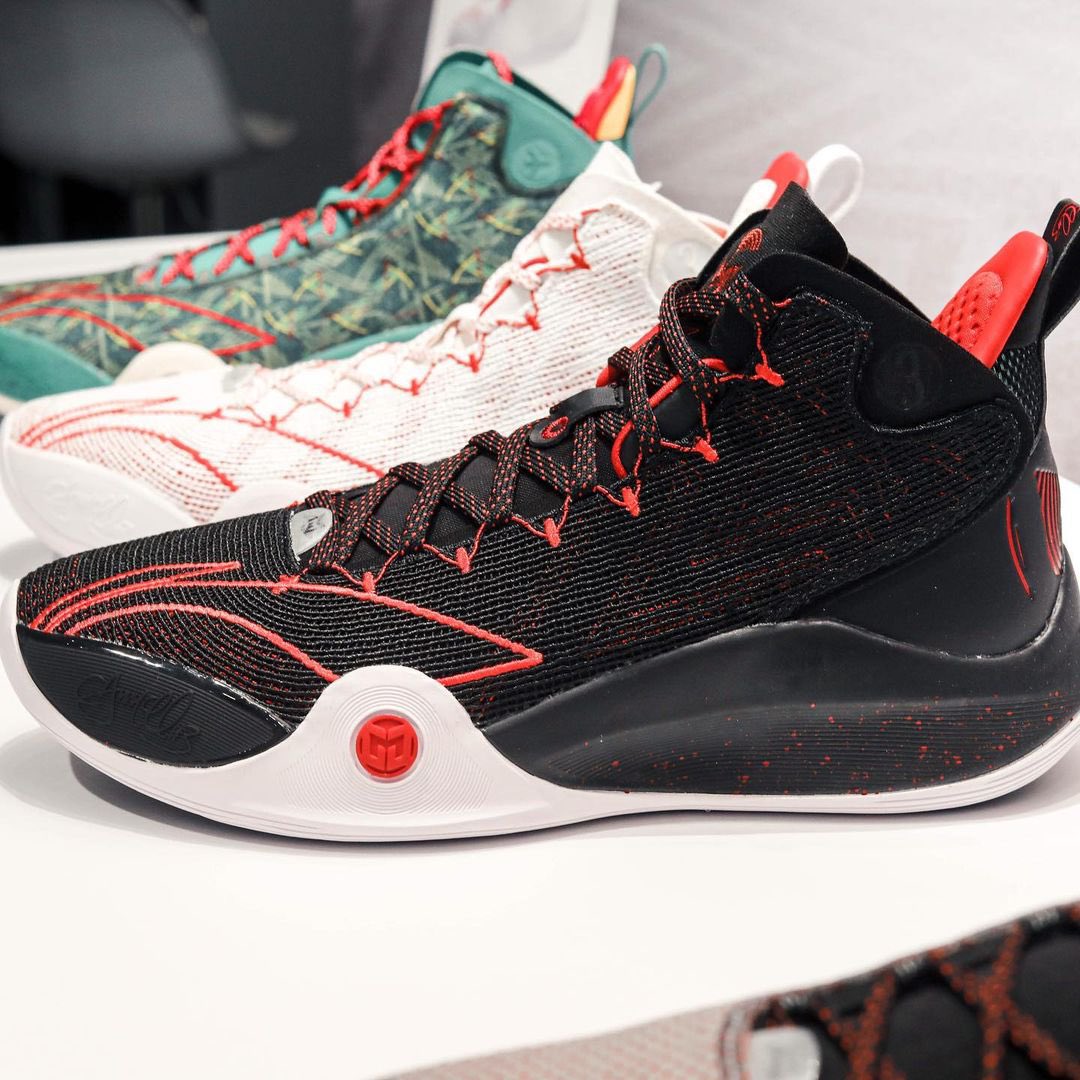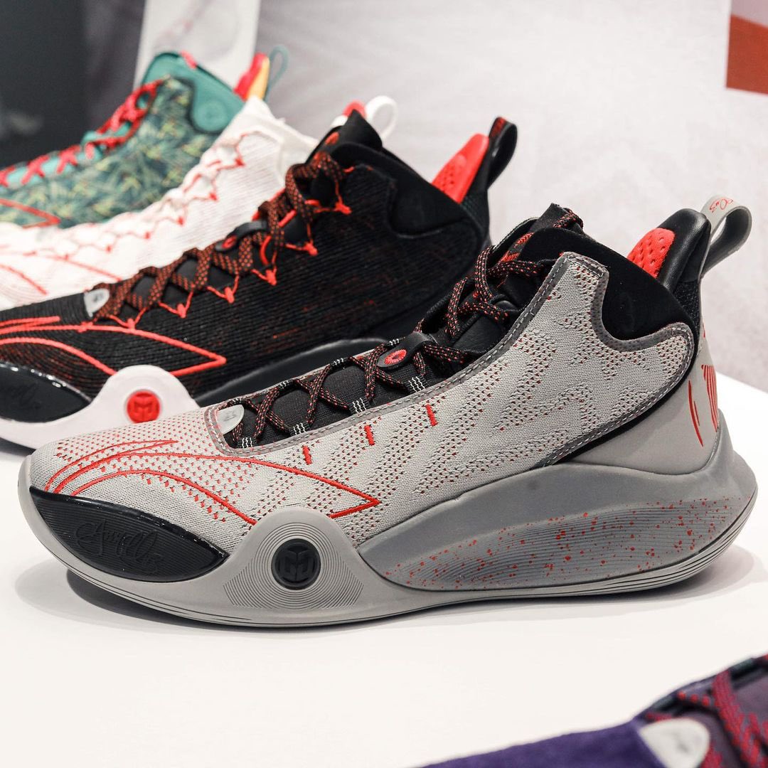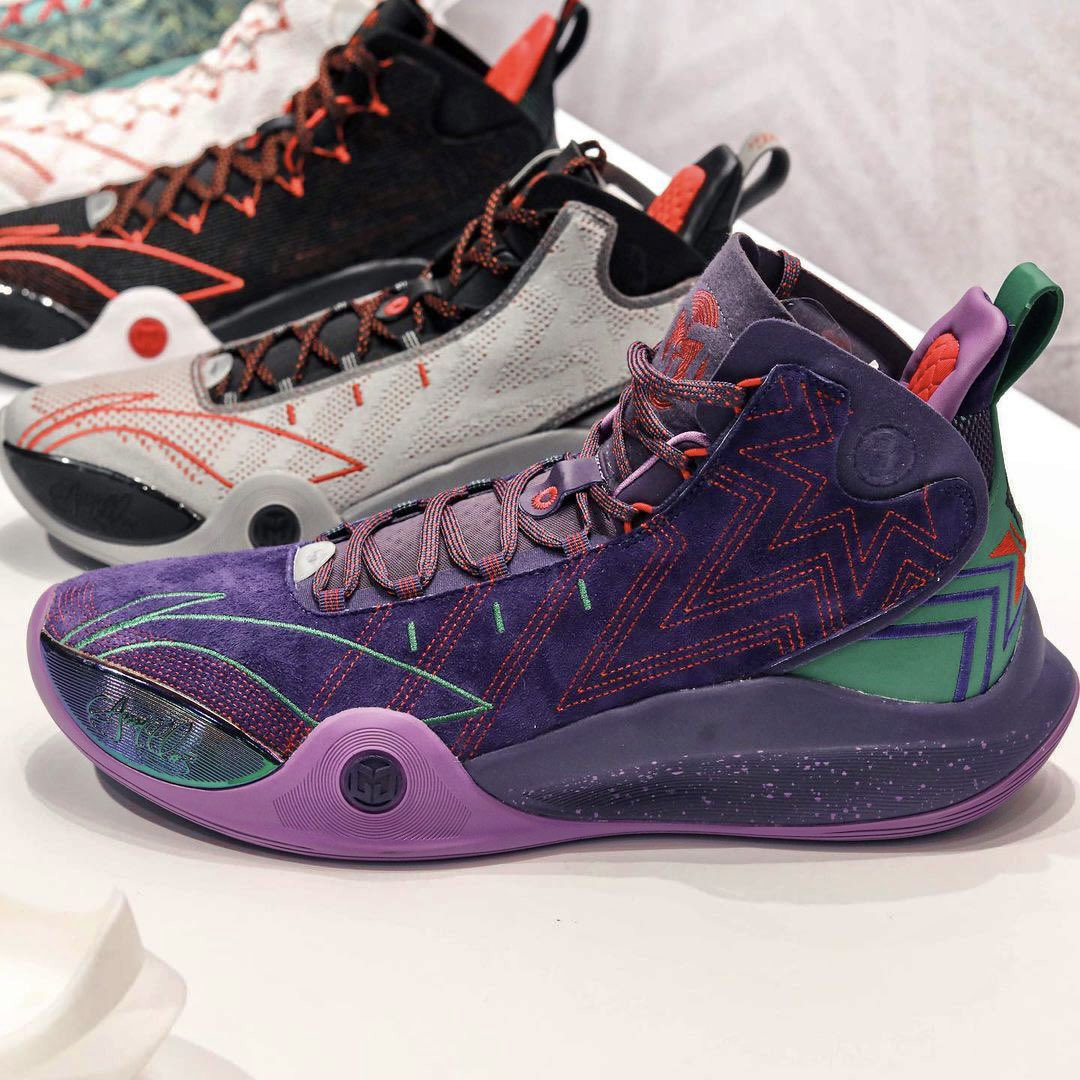 On peut voir trois coloris classiques, alternant blanc et rouge, noir, blanc et rouge, ainsi que gris, noir et rouge. Les deux autres sortent plutôt de l’ordinaire, avec un modèle principalement vert inspiré… de la moquette de l’aéroport international de Portland, coloris que Damian Lillard avait utilisé pour les D Lillard 1 et 2 il y a six ans de cela. On peut notamment voir le dessin d’un avion, et ce qui pourrait ressembler à une carte d’embarquement au niveau du talon. L’autre coloris original présente une paire « Joker » en violet, vert et gris tacheté.