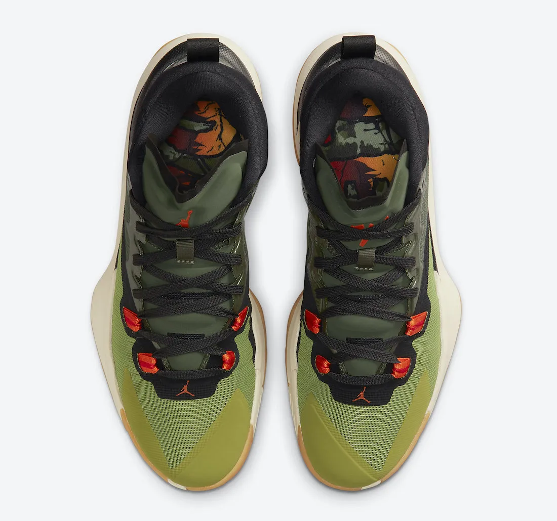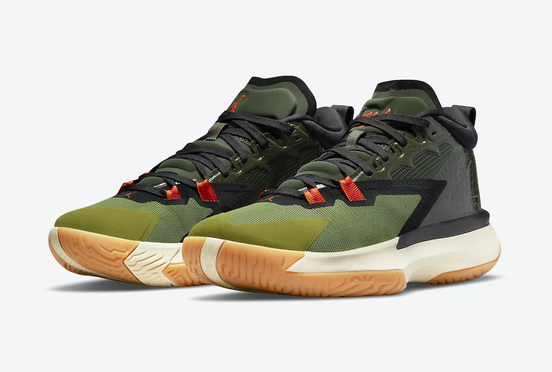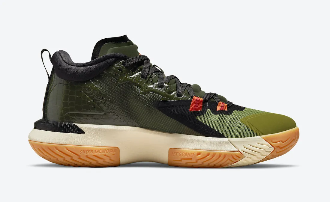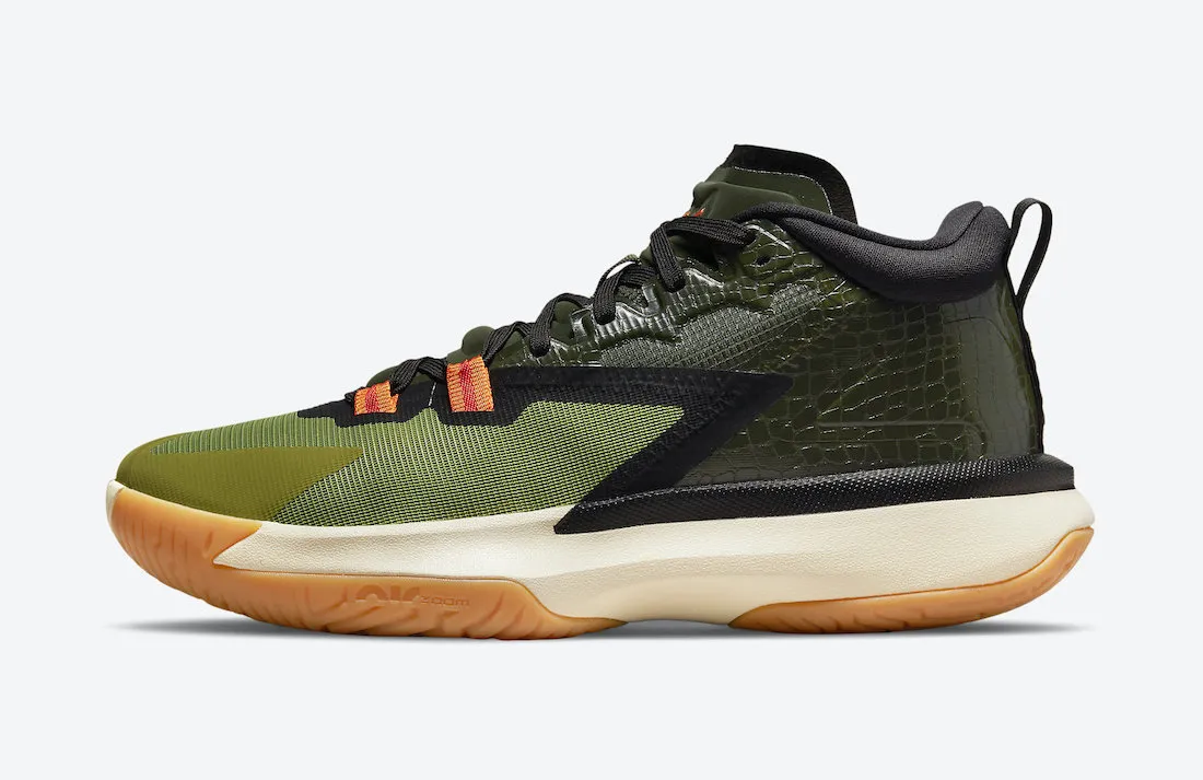 Le modèle s'affiche en différentes teintes de vert et un aspect peau de crocodile sur une partie de la tige qui fait son effet. Le Z de Zion sur l'empeigne et le col apparaissent en noir, l'ensemble reposant sur une semelle intermédiaire blanche et une semelle extérieure marron clair. A noter également quelques touches de rouge-orange, sur quatre attaches des lacets et les logos du « Jumpman » et Zion sur la languette et le talon.