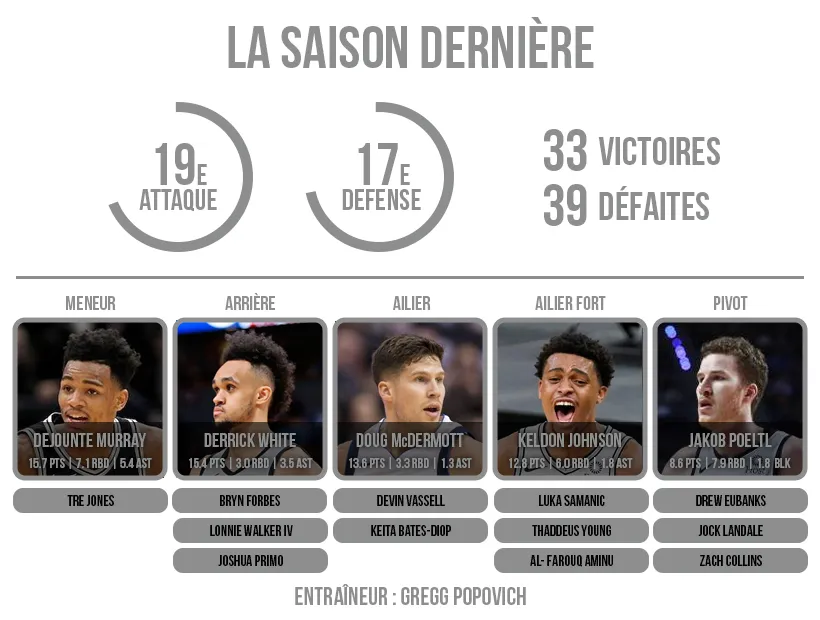 Car ce ne seront certainement pas les nouveaux venus Doug McDermott, Thaddeus Young, Bryn Forbes, Al-Farouq Aminu et Jock Landale qui rempliront cette tâche. Pas même les plus jeunes Jakob Poeltl, Lonnie Walker IV et Devin Vassell, trop justes pour y arriver.