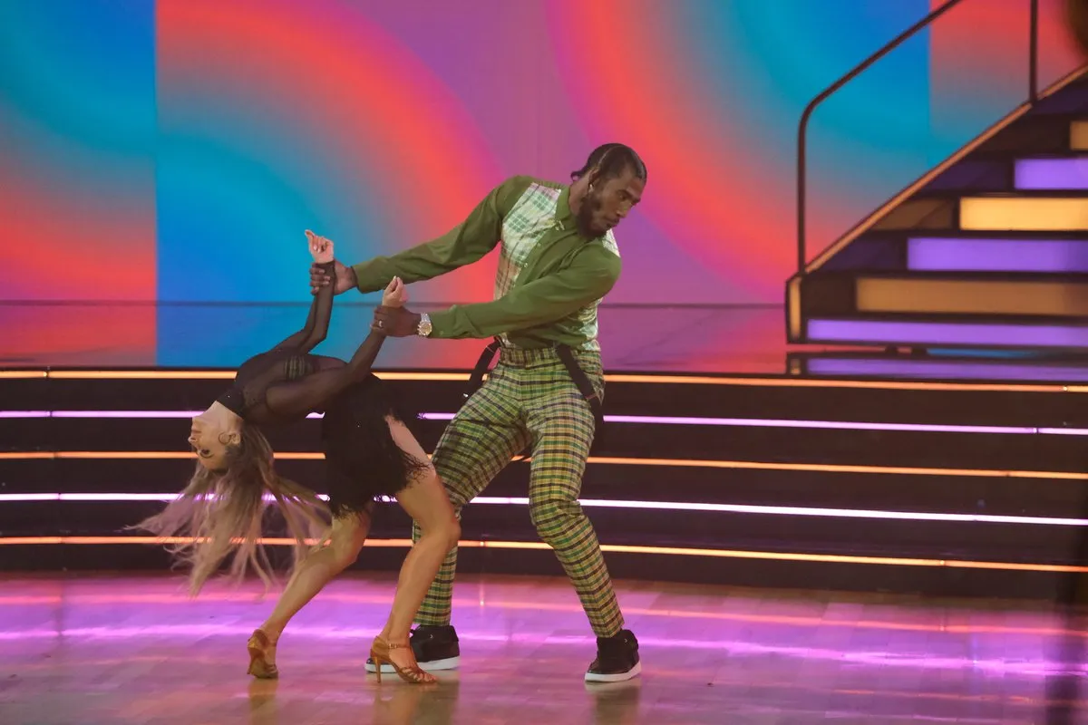 Vêtu d'un pantalon à carreaux surmonté de bretelles pour reprendre le look du groupe Outkast, puisqu'il dansait sur leur fameuse chanson ‘Hey Ya', Shumpert a montré une belle aisance sur scène avec sa partenaire Daniella Karagach.