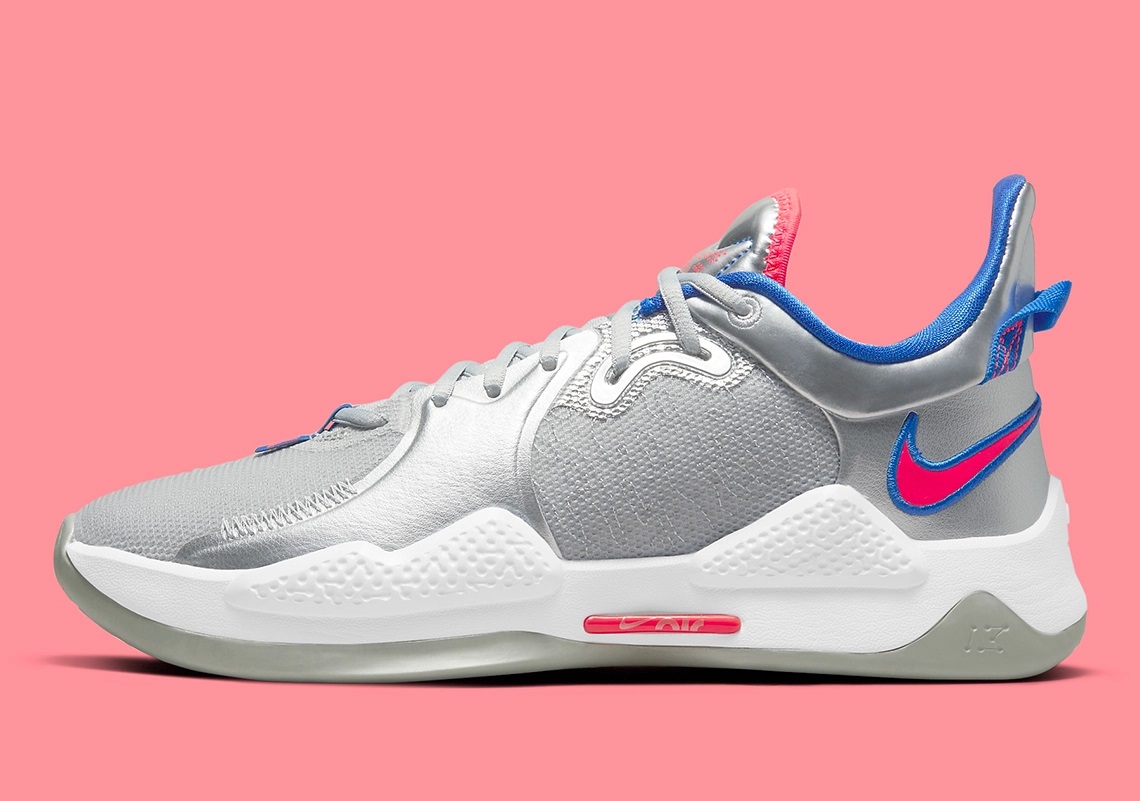 Le modèle est composé d’une tige en gris métal, une semelle intermédiaire entièrement blanche tranchant avec la semelle extérieure grise, ainsi que des touches de bleu et de rose foncé, plus proches du coloris initial porté par les Californiens. Le logo de Paul George apparaît sur une languette accrochée au bas des lacets, en rose sur fond bleu.