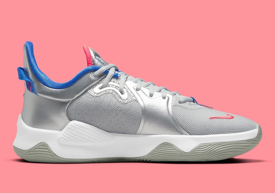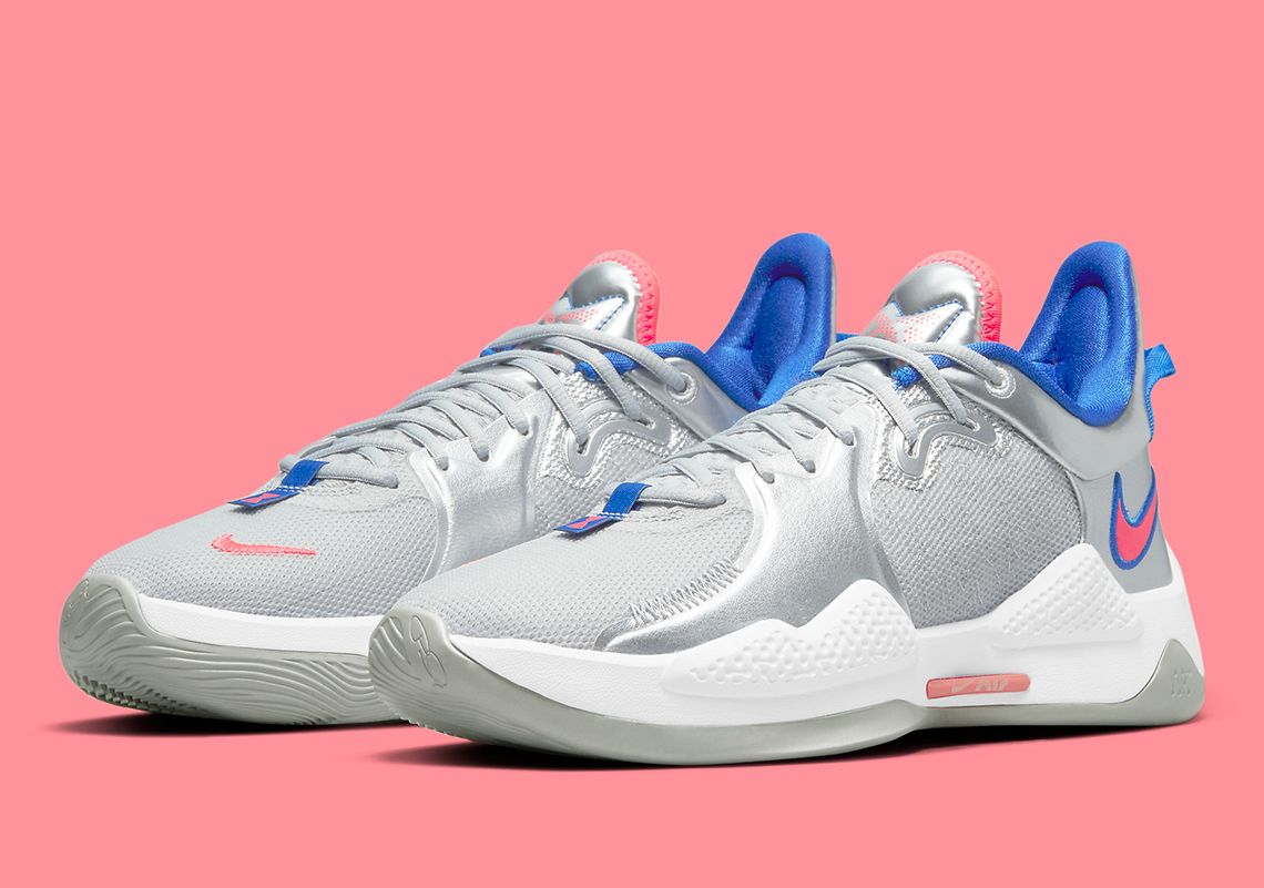 Le modèle est composé d’une tige en gris métal, une semelle intermédiaire entièrement blanche tranchant avec la semelle extérieure grise, ainsi que des touches de bleu et de rose foncé, plus proches du coloris initial porté par les Californiens. Le logo de Paul George apparaît sur une languette accrochée au bas des lacets, en rose sur fond bleu.