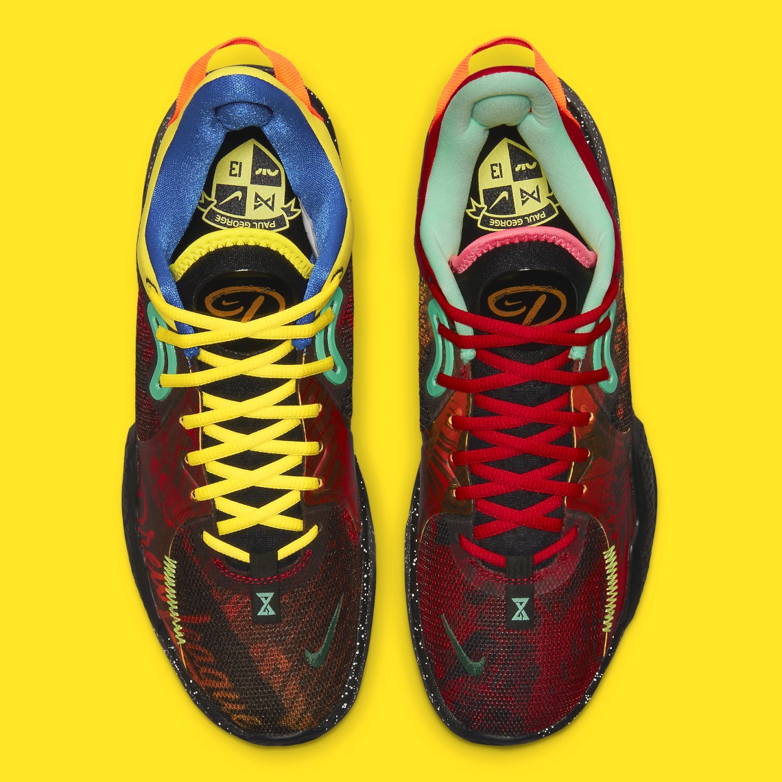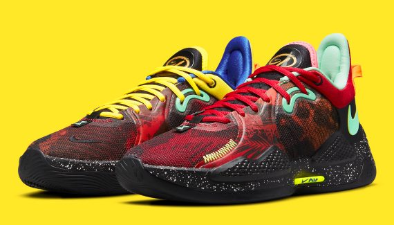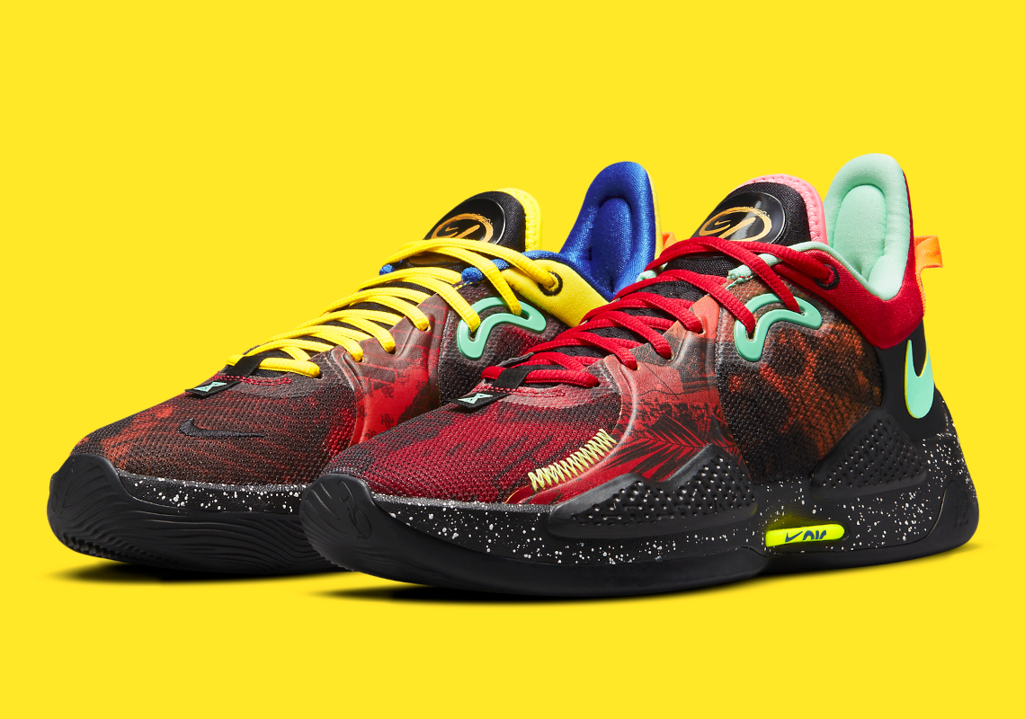 La PG 5 poursuit son offensive sur cette rentrée 2021 avec un nouveau coloris en prévision. Une version pour le moins osée, avec sa dose d’asymétrie et son plein de couleurs. La tige est principalement recouverte d’un coloris noir et rouge aux motifs pour le moins originaux.