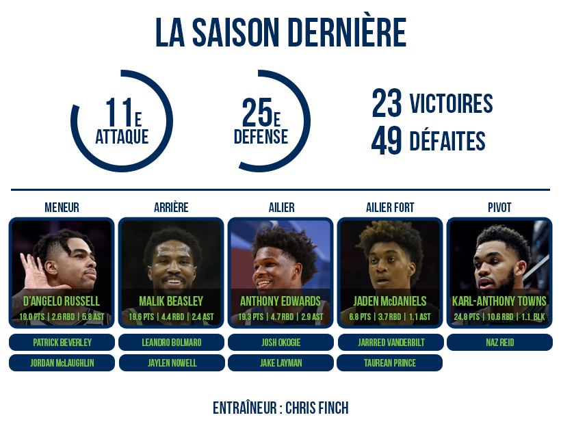 Sur le terrain, c’est l’association D’Angelo Russell – Anthony Edwards – Karl-Anthony Towns qui doit désormais fonctionner. Pour cela, il faudra que le meneur évite (enfin) les blessures, pour pouvoir trouver des repères et créer des automatismes avec ses camarades. Il faudra également entourer au mieux ce trio, surtout défensivement.