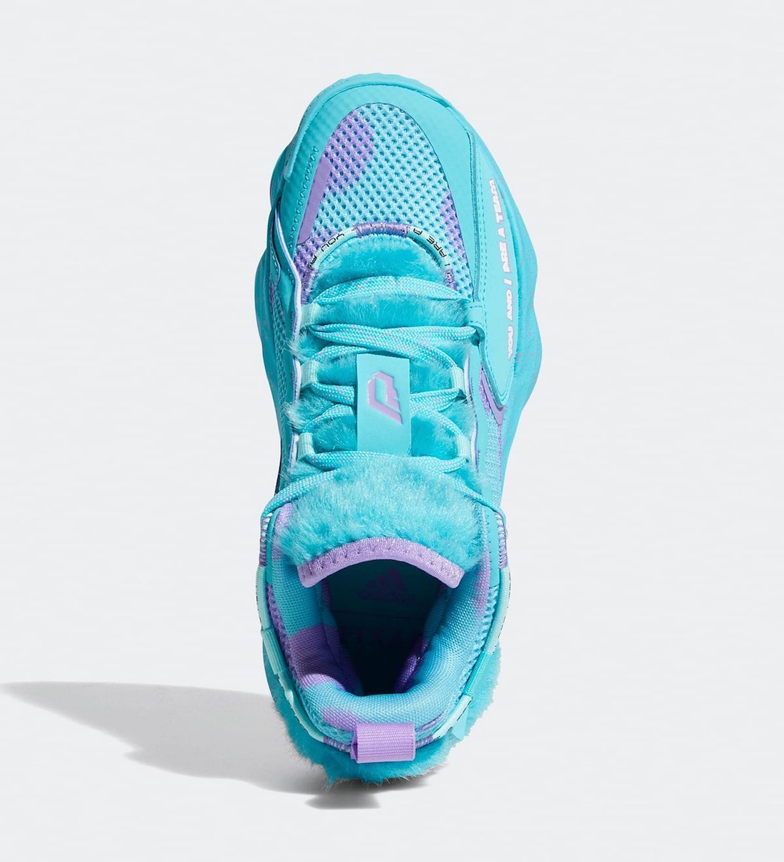 Et après une version vert fluo en clin d’œil au mini-cyclope vert, c’est Jacques Sullivan, un monstre à la fourrure bleue et violette qui a servi d’inspiration. La tige est donc mêlée de bleu et de violet avec deux touches de fourrure bleue qui font leur effet, sur la languette et le talon. L’inscription « You and I are a team » apparaît sur l’avant de la chaussure et les lacets.