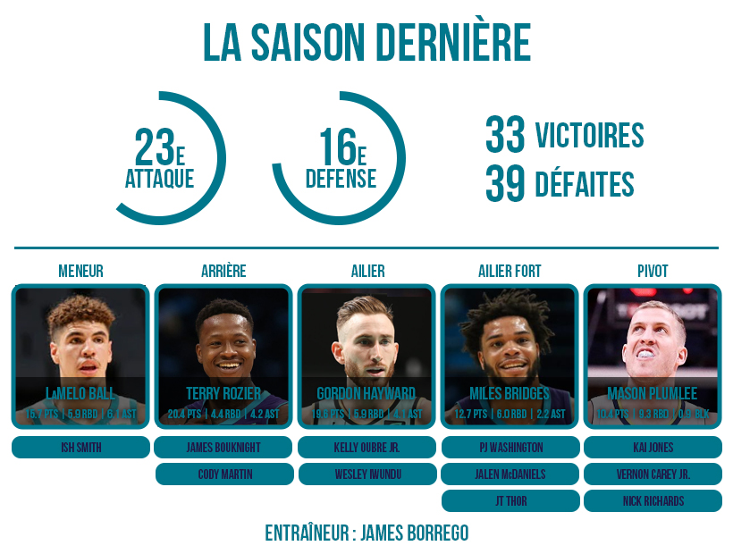 Les recrues de l’intersaison vont-elles bonfier le groupe déjà en place ? Il faudra attendre la fin de la saison pour y répondre, même si, sur le papier, les apports de Kelly Oubre Jr. dans un registre de dynamiteur extérieur, Mason Plumlee, intérieur polyvalent d’expérience, semblent correspondre à la volonté de James Borrego de produire un basket “up-tempo”. LaMelo Ball va également disposer de davantage d’espace pour s’exprimer avec le départ de Devonte’ Graham, compensé numériquement par le vétéran référencé Ish Smith.