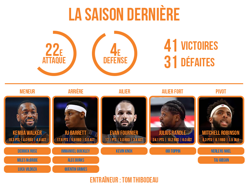 Arrivées : Quentin Grimes (Draft), Miles McBride (Draft), Kemba Walker (Thunder), Evan Fournier (Celtics).