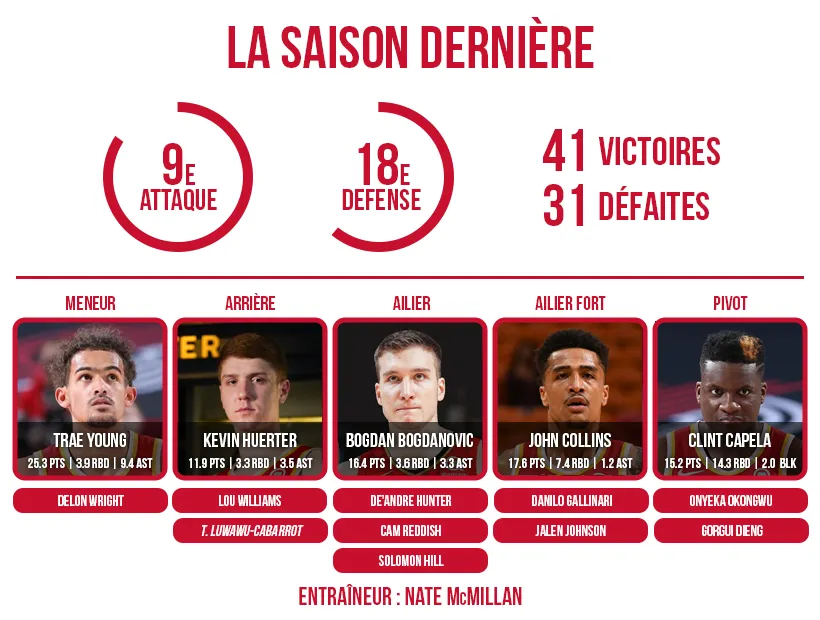 Surprenant finaliste de conférence, surtout quand on sait qu'ils ne disposaient pas de leur effectif au complet, les Hawks se sont constitués une très belle, et jeune, équipe autour de Trae Young et John Collins. Le trident européen est toujours en place avec Clint Capela sous les panneaux et Bogdan Bogdanovic et Danilo Gallinari sur les extérieurs alors que De'Andre Hunter et Cam Reddish espèrent retrouver leur meilleure forme.