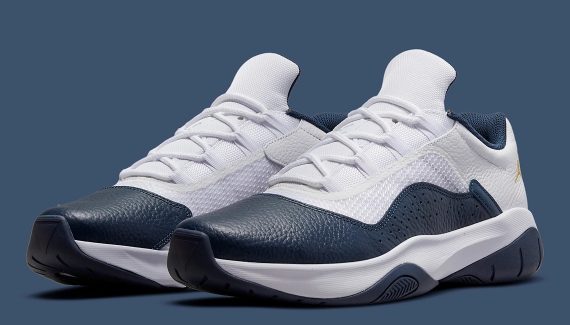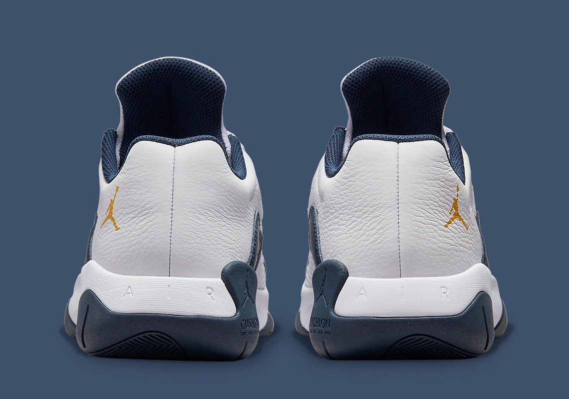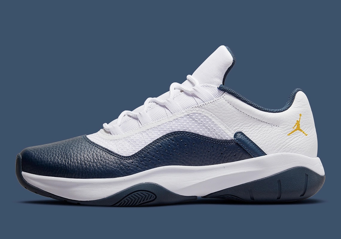 C’est le cas pour cette Air Jordan 11 CMFT low qui est donc habillée aux couleurs des Wolverines de Michigan. Avec un ensemble en cuir bleu marine à l’avant et blanc à l’arrière, partiellement recouvert d’une fine maille. C’est sur la partie blanche que le logo de Jordan Brand ressort en jaune.