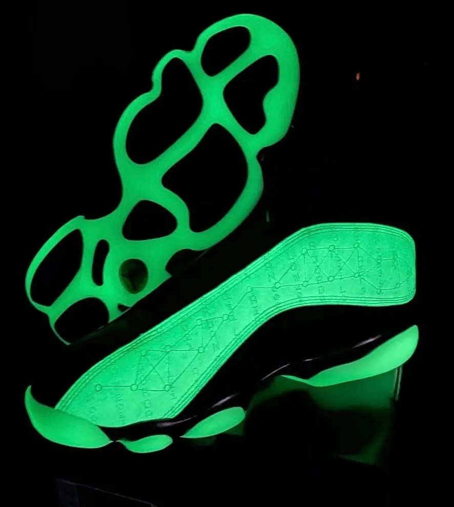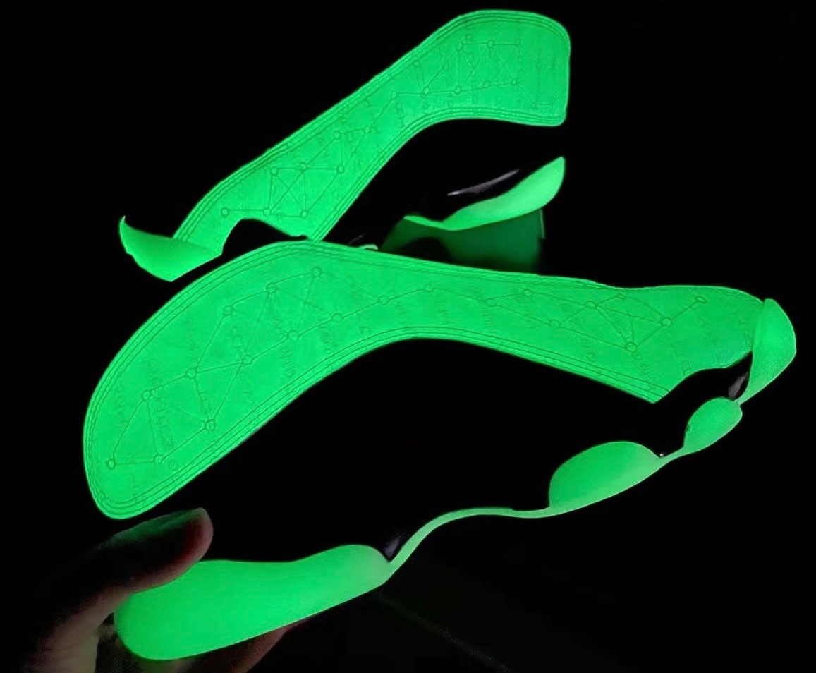 Rien ne dit que cette paire vous sortira définitivement du célibat. Elle vous permettra en revanche de briller dans le noir puisque les panneaux « blanc-vert » recouvrant le haut de la tige formée par un mix entre cuir et daim noir, ainsi que sa semelle extérieure, sont phosphorescents !