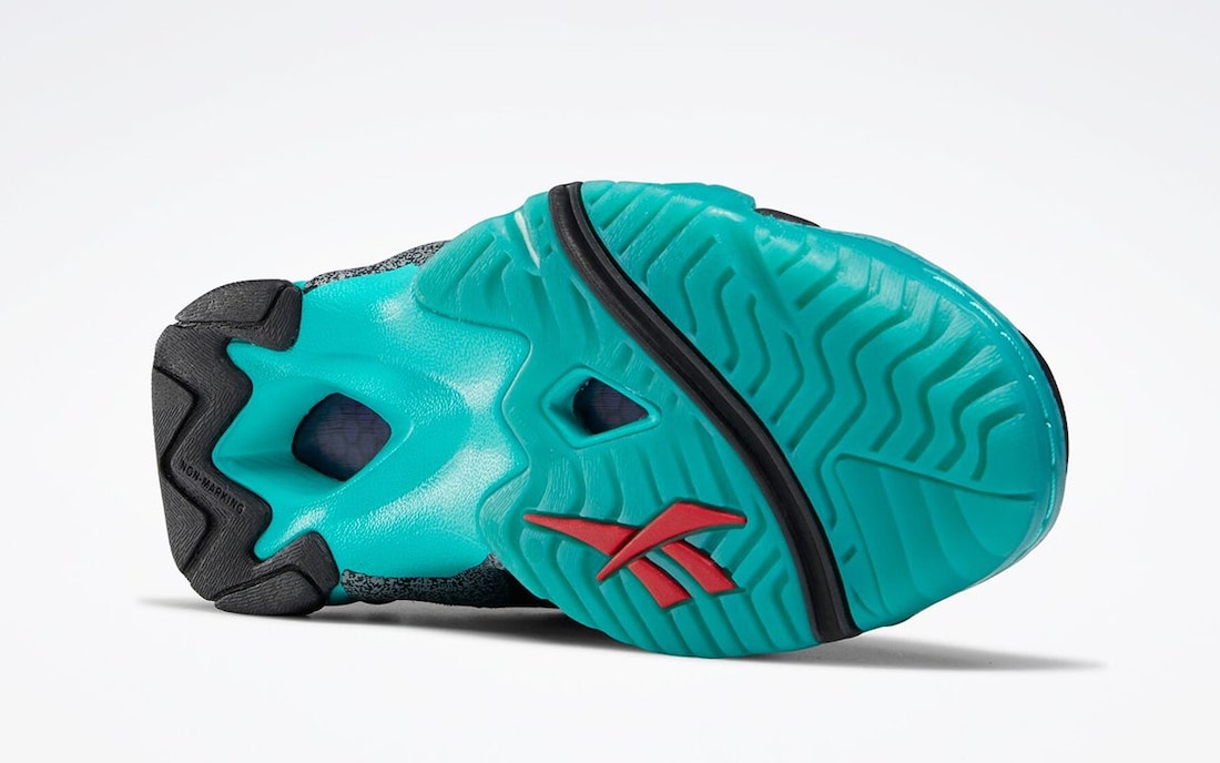 Le logo Reebok ressort en rouge tandis que l’avant de la semelle extérieure ressort en bleu-turquoise. A noter également la signature de Shawn Kemp en blanc au niveau de la cheville. Le logo Nice Kicks d’inspiration rétro est présent sur la languette.