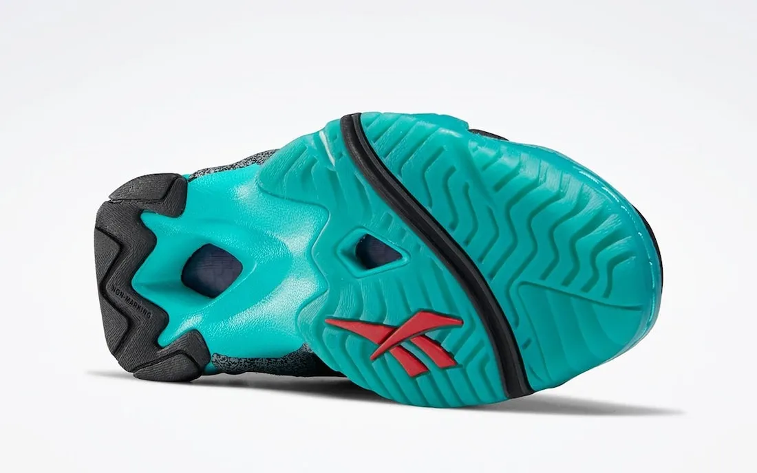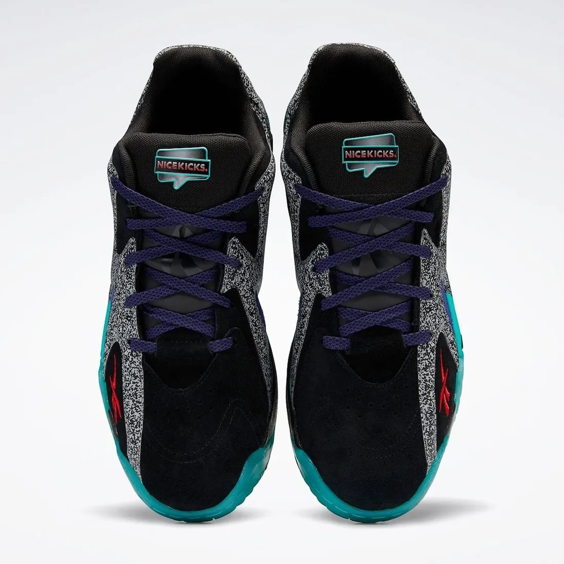 Le logo Reebok ressort en rouge tandis que l'avant de la semelle extérieure ressort en bleu-turquoise. A noter également la signature de Shawn Kemp en blanc au niveau de la cheville. Le logo Nice Kicks d'inspiration rétro est présent sur la languette.