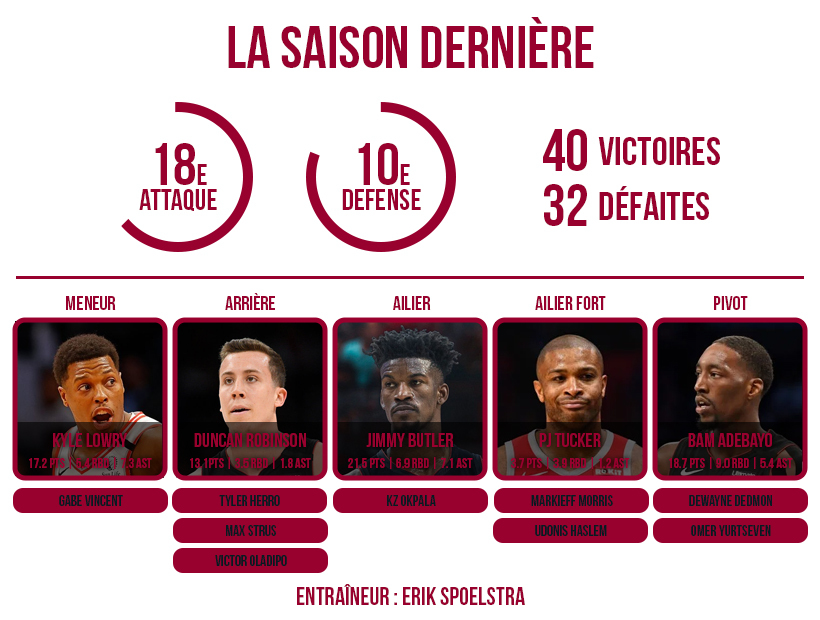 Le recrutement risqué de vétérans avec un kilométrage élevé se retourne contre le Parrain Riley avec Lowry dont le physique commence à coincer, comme Dragic son prédécesseur. Toujours économisé, Butler perd peu à peu de son mordant, et encore pire, de son emprise sur son équipe. Malgré l’académie de jeu déjà en place, le Heat n’arrive toujours pas à instituer une attaque digne de ce nom, et il manque ce fameux intérieur fuyant si précieux dans la NBA actuelle.