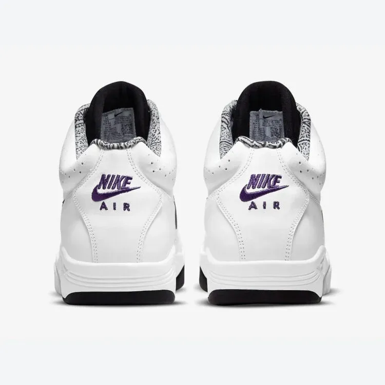 La paire revient avec un coloris classique blanc et noir, avec l'inscription « Nike Air » en violet sur le talon. Le cuir blanc est utilisé sur l'empeigne avec le Swoosh et la languette en néoprène qui ressortent en noir. L'intérieur du col est en imprimé éléphant quand la semelle intermédiaire blanche repose sur une semelle extérieure noire et blanche.