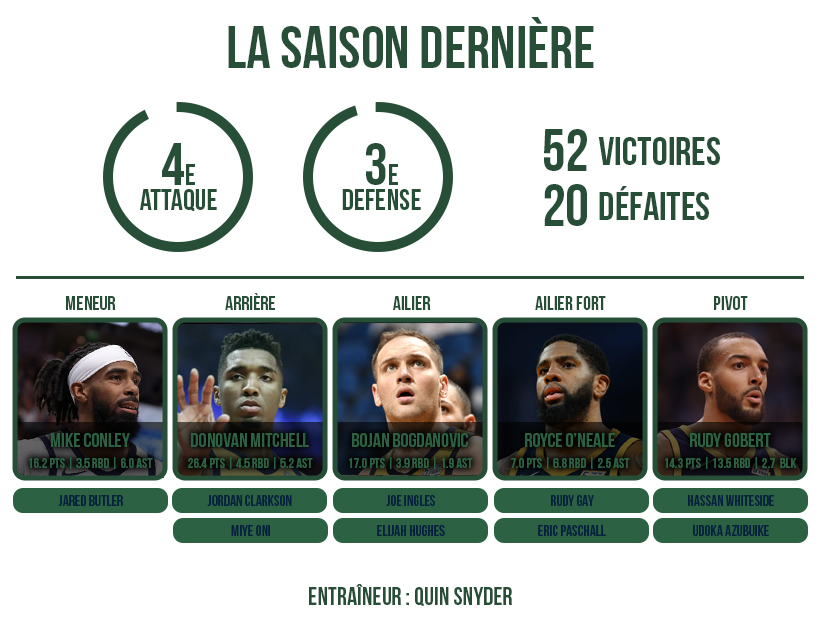 Alors qu’il a été question de mouvements potentiels au sein de l’effectif, les dirigeants ont misé sur la continuité. Le principal fait d’arme estival a été la re-signature de Mike Conley. L’an passé, le meneur de 34 ans a réalisé un deuxième exercice beaucoup plus convaincant dans l’Utah. Et en playoffs, il avait démarré fort face à son ancienne équipe de Memphis. Mais l’intéressé reste un joueur fragile physiquement…