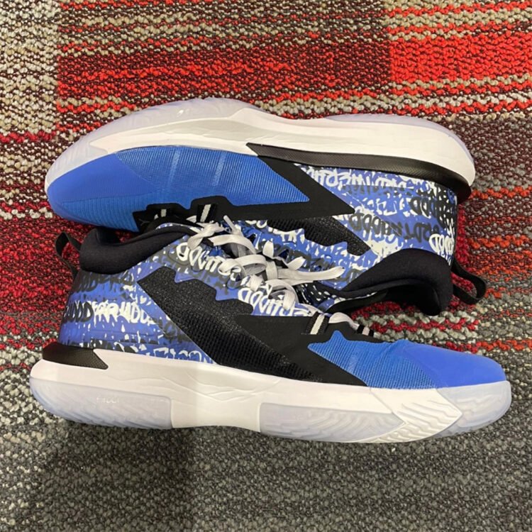 On y voit la paire signée Jordan Brand avec un coloris bleu, noir et blanc, aux couleurs des Blue Devils, avec l’inscription « Brotherhood » tagué sous différentes couleurs sur la partie au niveau du talon et le long des lacets. Si son prix ne devrait pas bouger (120 dollars), sa date de commercialisation est désormais attendue avec impatience !
