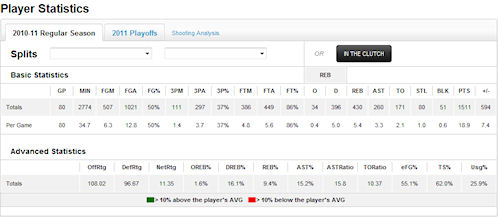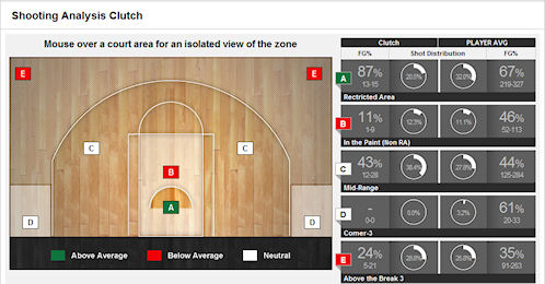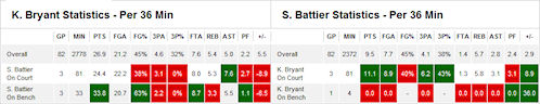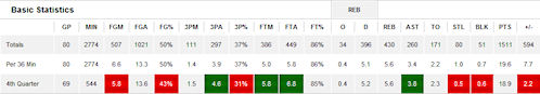 Celat dit, les stats du joueur sur l’ensemble de la saison sont également ramenées à 36 minutes ce qui permet une comparaison simple d’autant plus qu’un système de couleurs est mis en place afin de favoriser une lecture rapide : vert pour signaler que les stats sont au moins 10% supérieures à celles du joueur en général et rouge lorsqu’au contraire, elles sont au moins 10% inférieures.