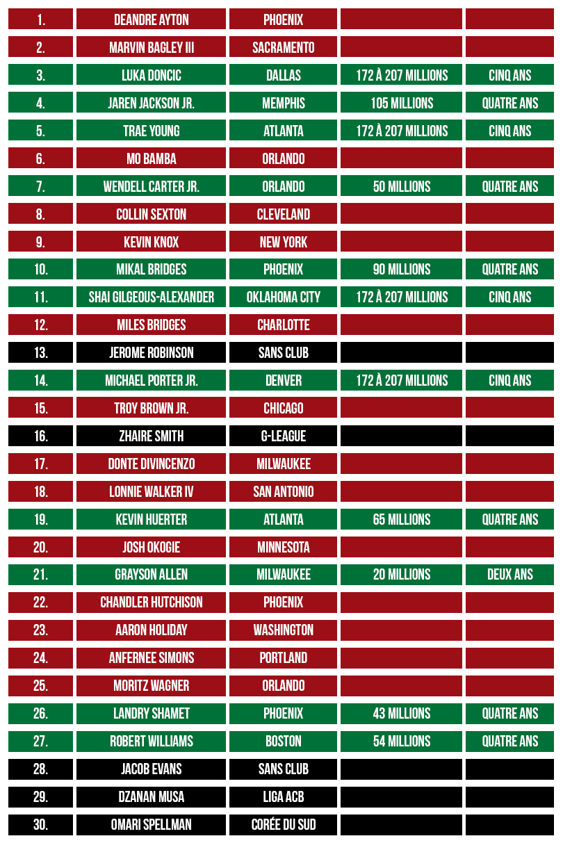 Cette Draft 2018 a néanmoins marqué l’histoire récente de la Ligue avec plus d’un milliard de dollars investis sur ces prolongations de contrat, avec la dernière très grosse pour Jaren Jackson Jr. (105 millions sur quatre ans).